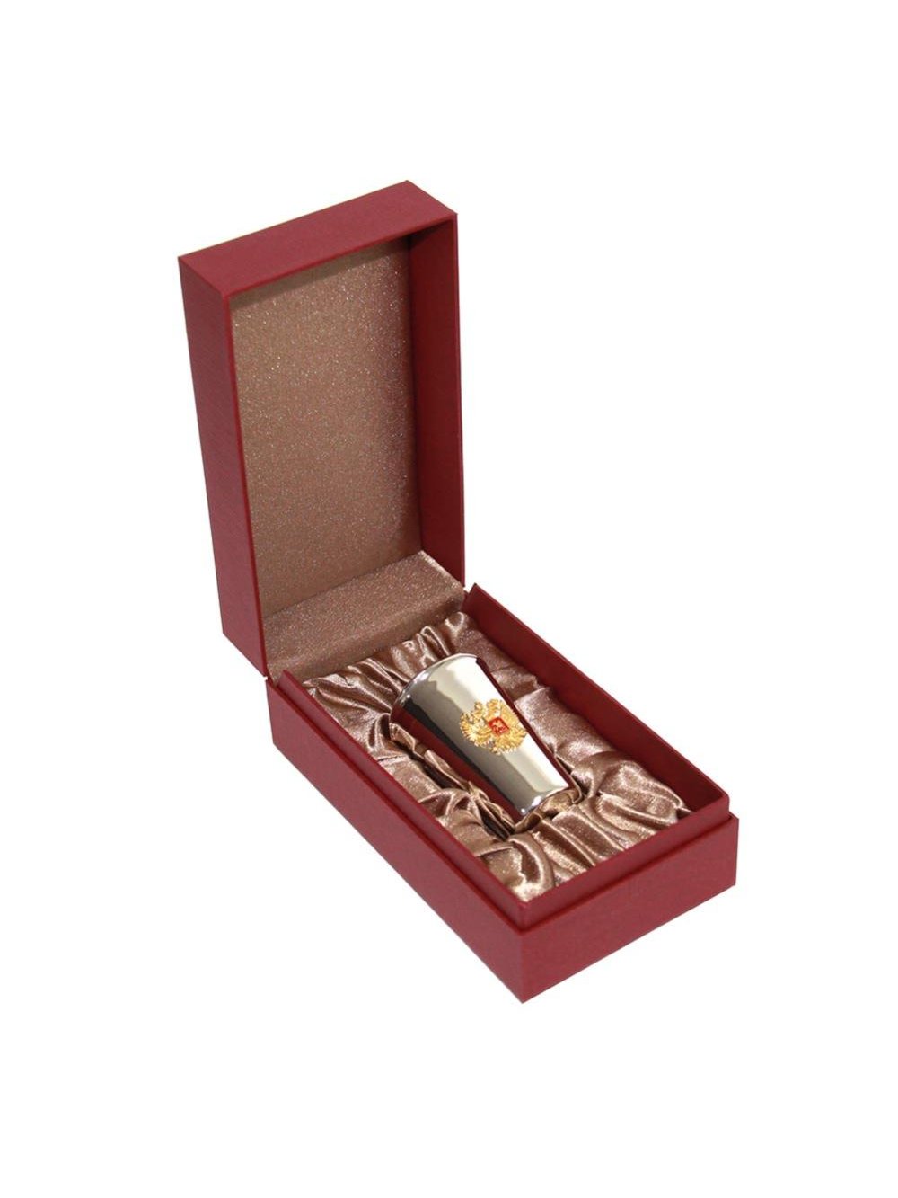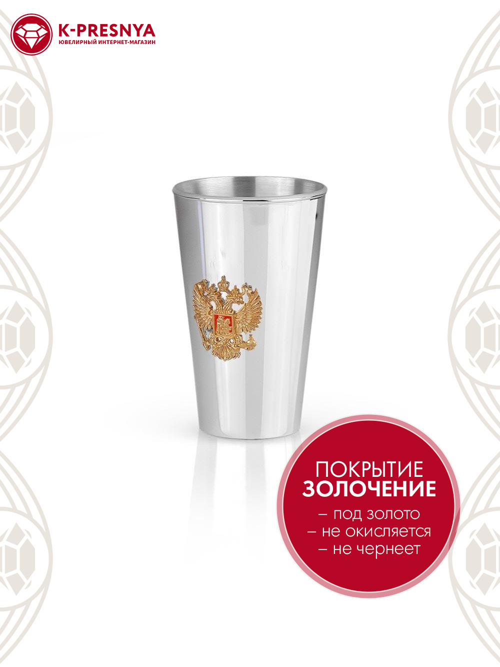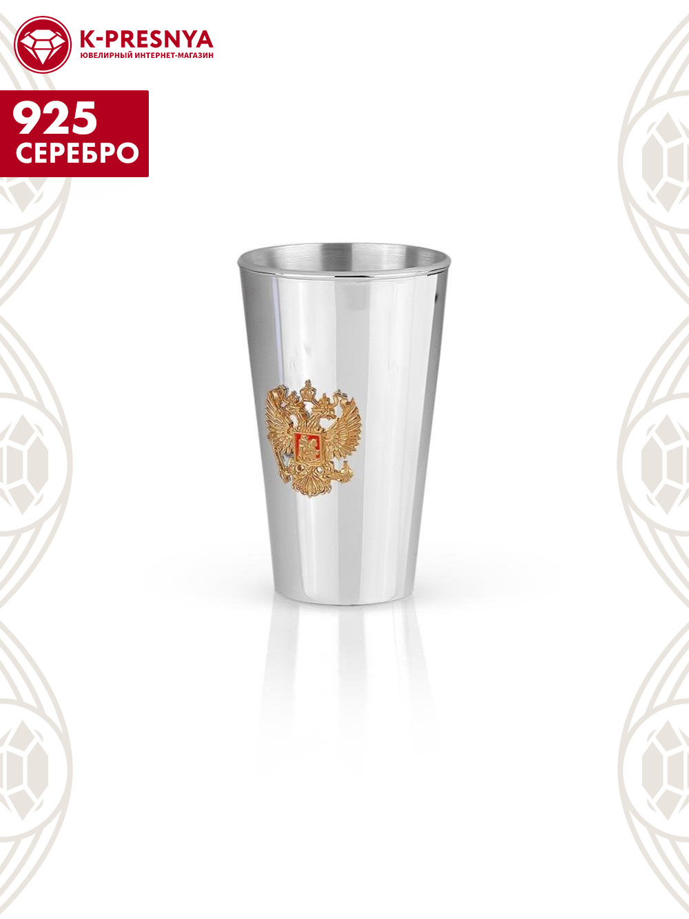 Стопка выполнена в классической форме из серебра высочайшей пробы. Отполированная поверхность изделия выгодно подчеркивает позолоченный державный герб, который украшает стопку.