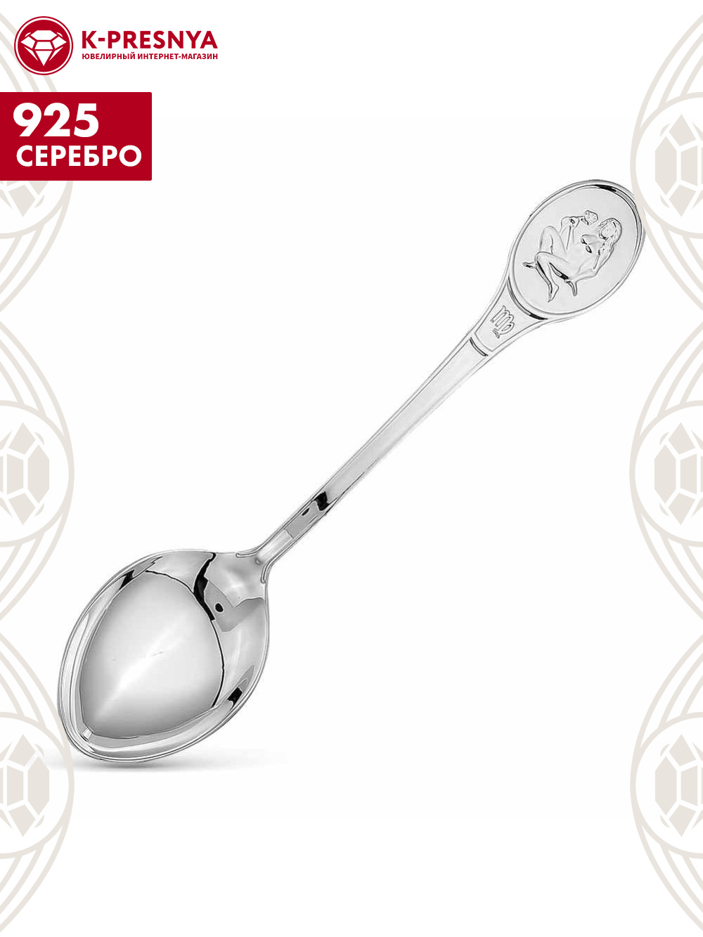Аккуратная и удобная ложка выполнена из серебра 925°. В верхней части черенка изображен знак гороскопа – Дева. Поверхность ложки отполирована вручную, что придает изделию невероятный блеск.
