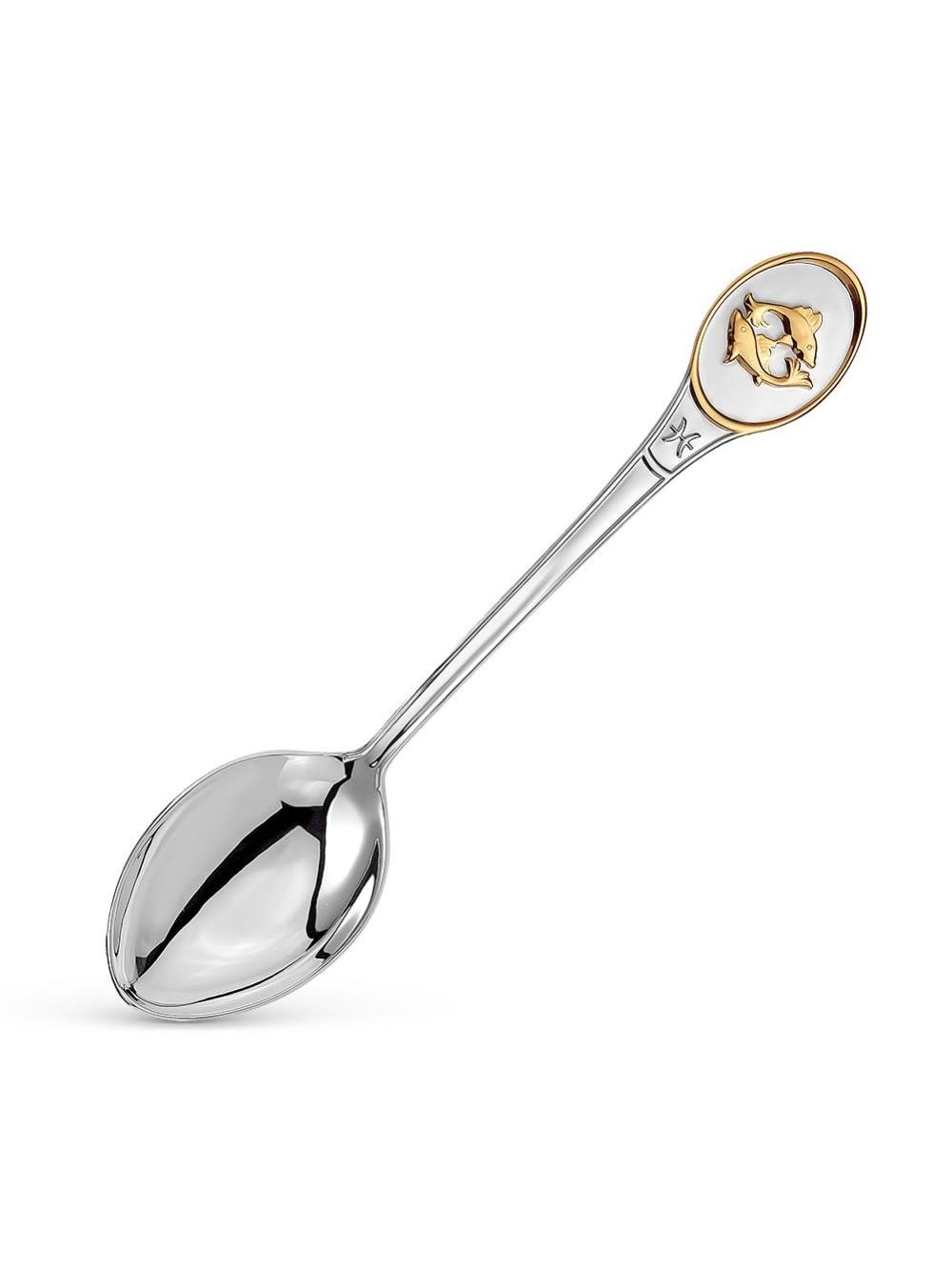 Аккуратная и удобная ложка выполнена из серебра 925°. В верхней части черенка изображен позолоченный знак гороскопа – Рыбы. Поверхность ложки отполирована вручную, что придает изделию невероятный блеск.