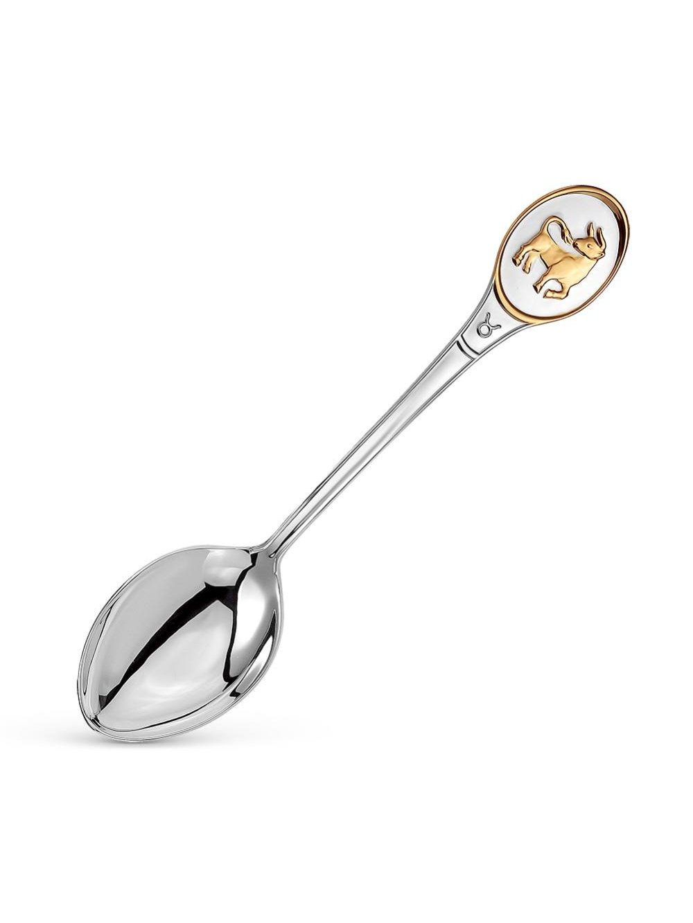 Аккуратная и удобная ложка выполнена из серебра 925°. В верхней части черенка изображен позолоченный знак гороскопа – Телец. Поверхность ложки отполирована вручную, что придает изделию невероятный блеск.