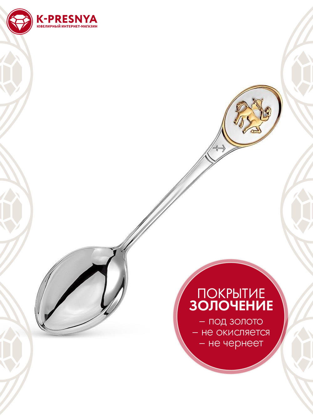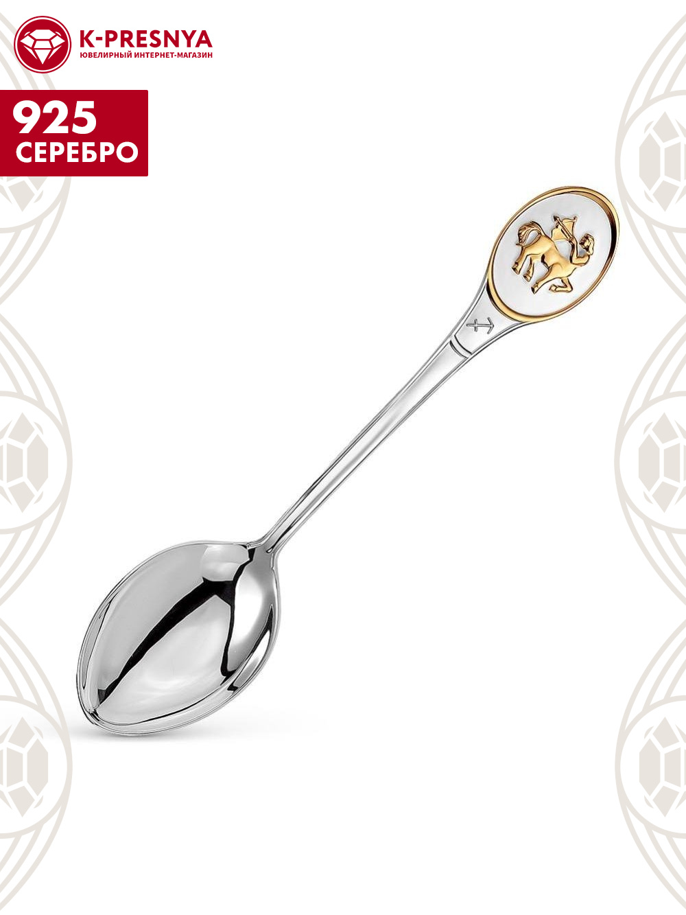 Аккуратная и удобная ложка выполнена из серебра 925°. В верхней части черенка изображен позолоченный знак гороскопа – Стрелец. Поверхность ложки отполирована вручную, что придает изделию невероятный блеск.