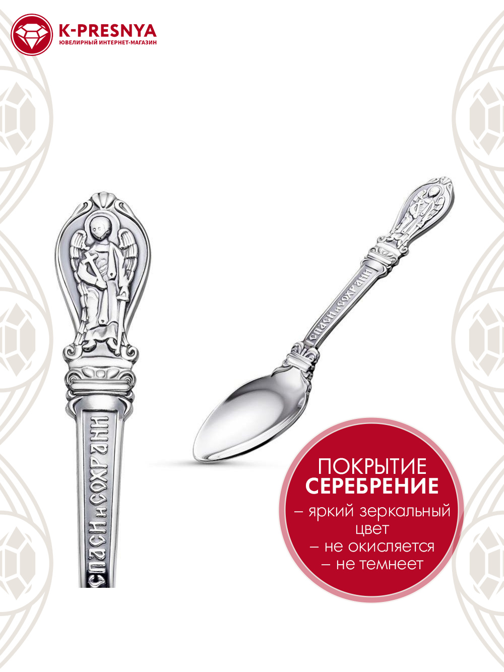 В верхней части черенка расположено символичное изображение «Ангела». По всему черенку расположена надпись «Спаси и Сохрани». Чайная ложка с ангелом «Спаси и сохрани» - изумительный подарок ребенку.