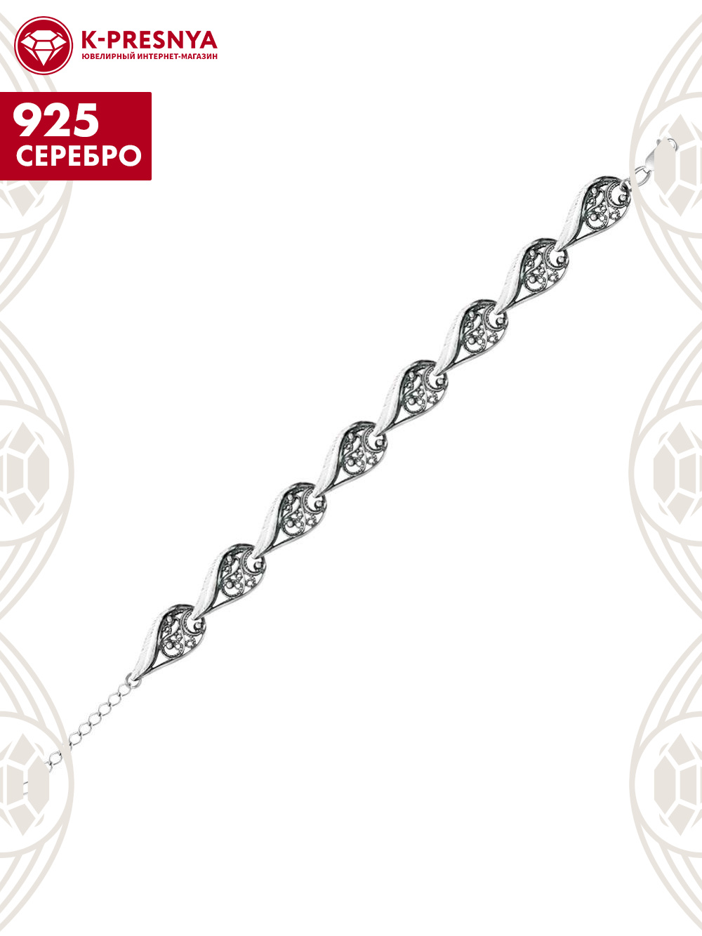Браслет с дополнительной цепочкой 50 мм, которая позволяет регулировать размер.