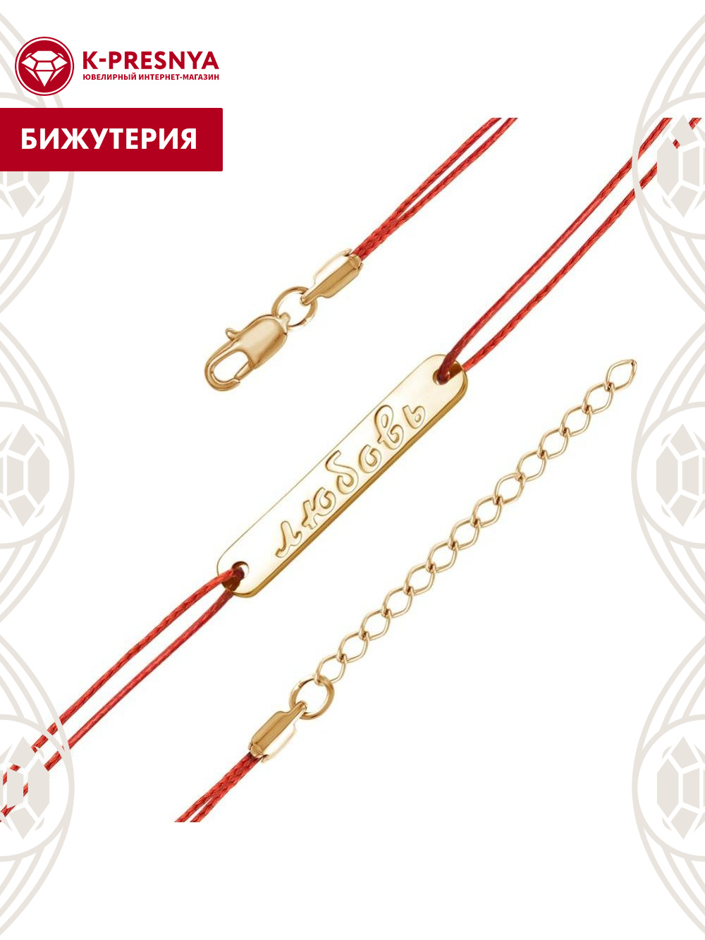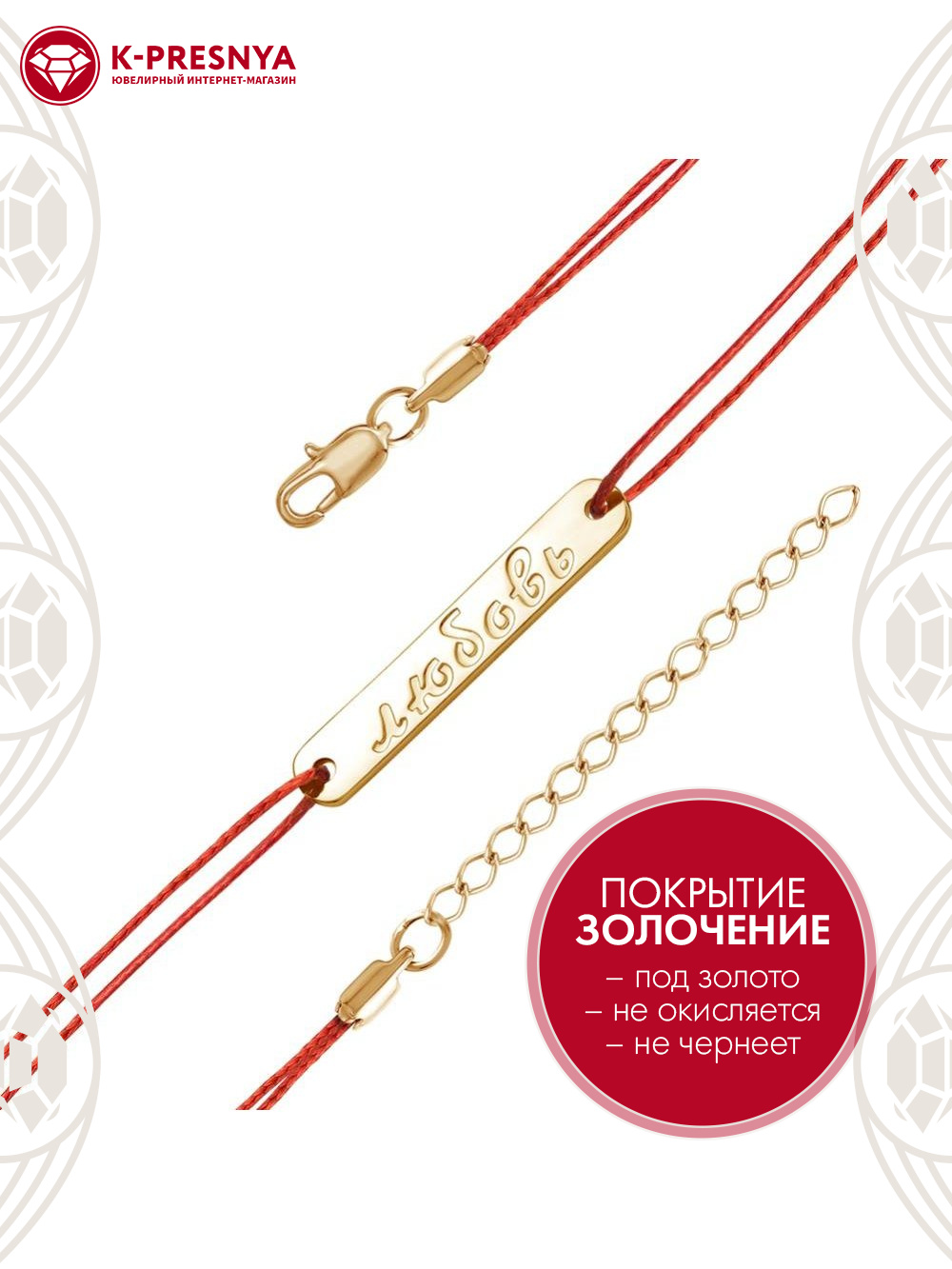 Красная нить с надписью "Любовь" и дополнительной цепочкой 50 мм, которая позволяет регулировать размер