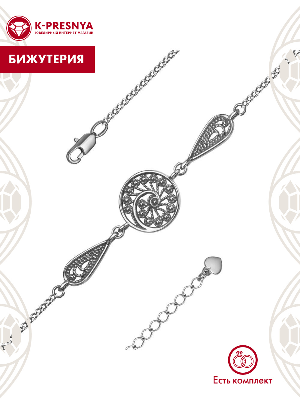 Браслет бижутерия, покрытие - серебрение с оксидированием, без вставок