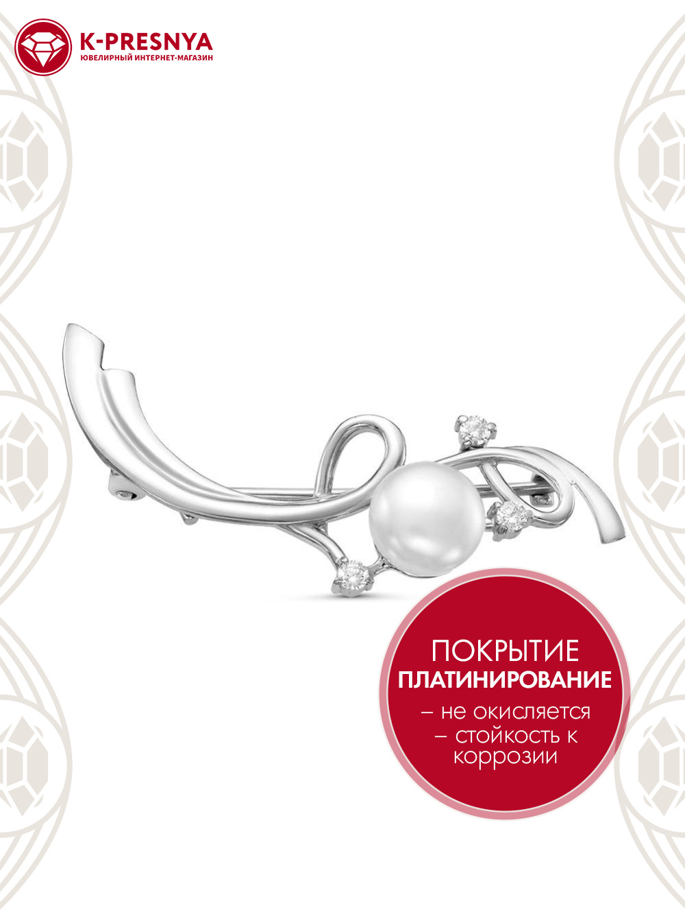 Брошь бижутерия, покрытие - платинирование, вставка - культивированный жемчуг, фианит (недрагоценный камень)
