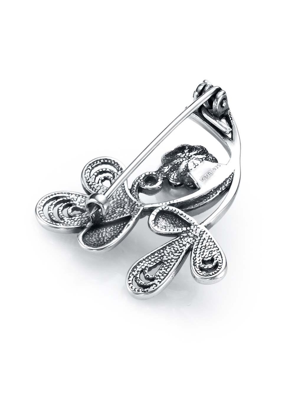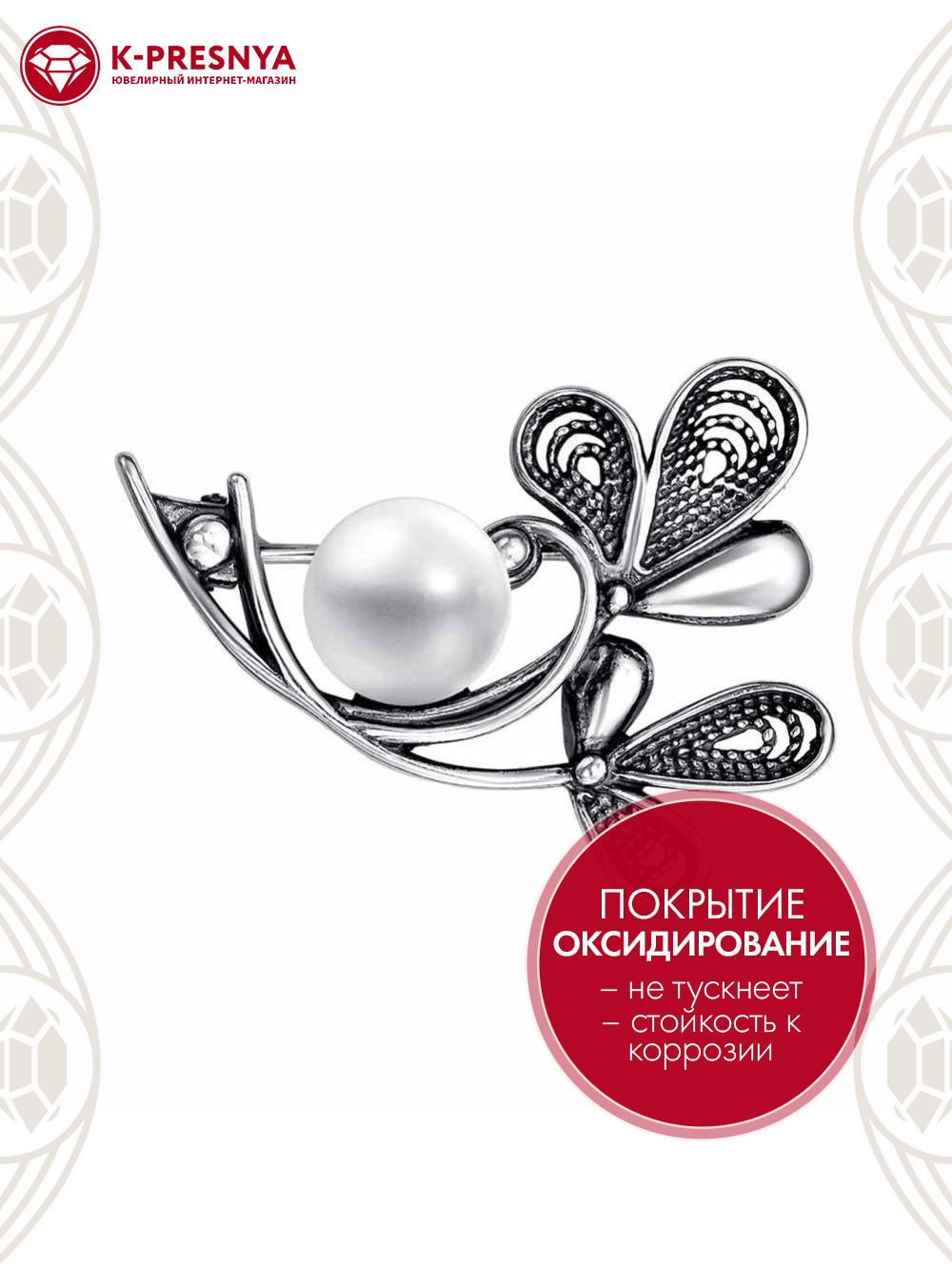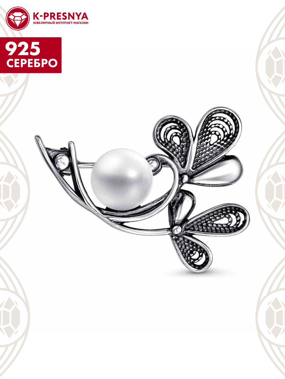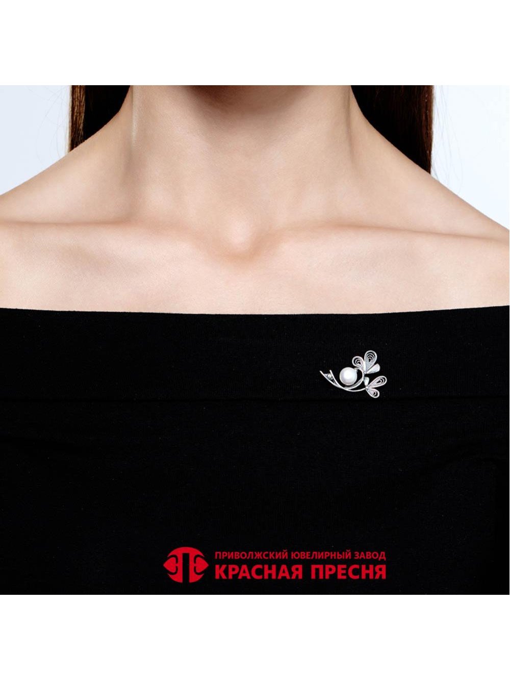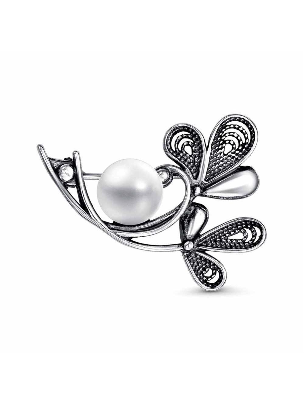 Брошь серебро 925 пробы, покрытие - оксидирование, вставка - культивированный жемчуг