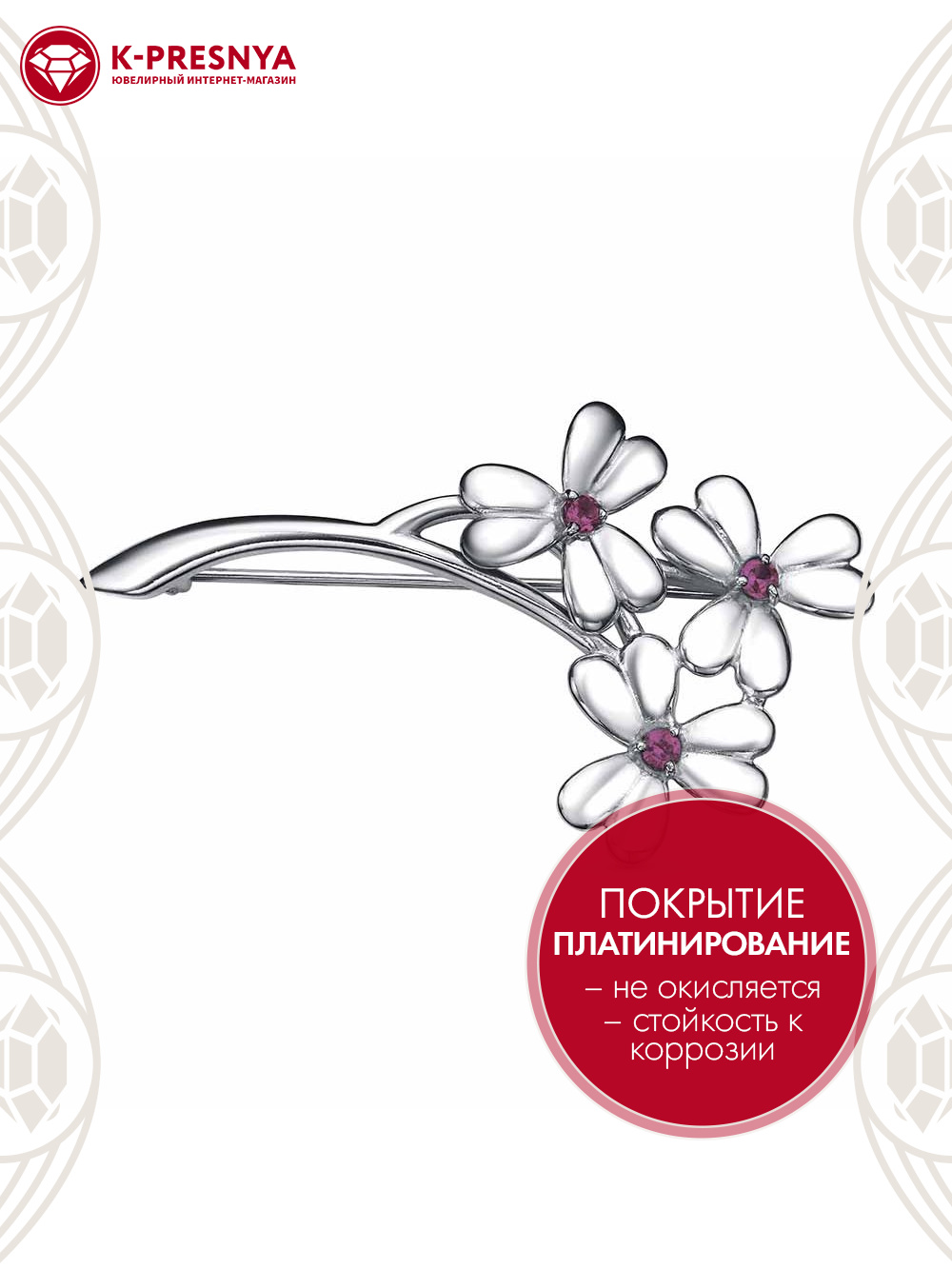 Брошь серебро 925 пробы, покрытие - платинирование, вставка - синтетический корунд