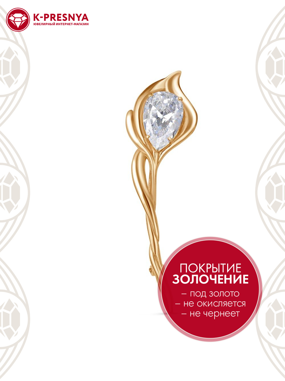 Брошь бижутерия, покрытие - золочение, вставка - фианит (недрагоценный камень)