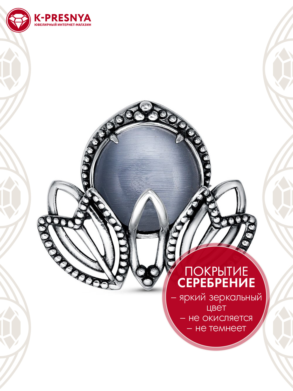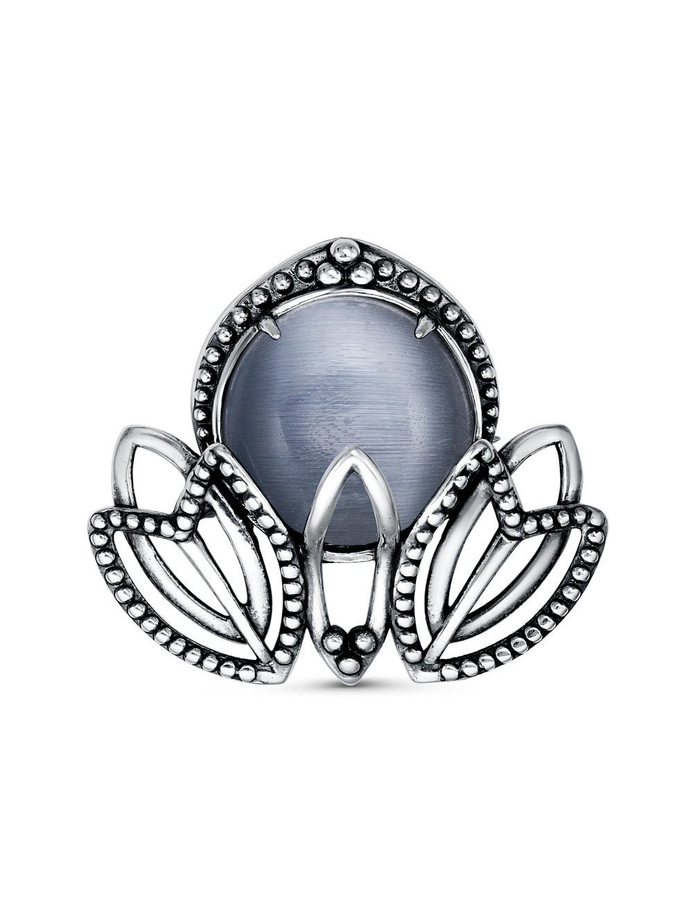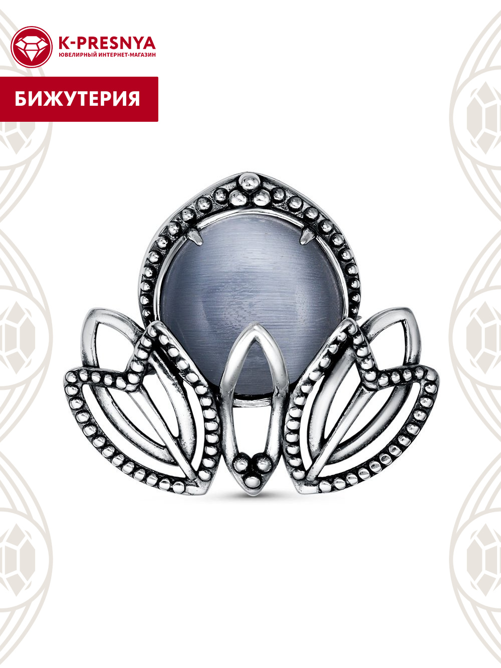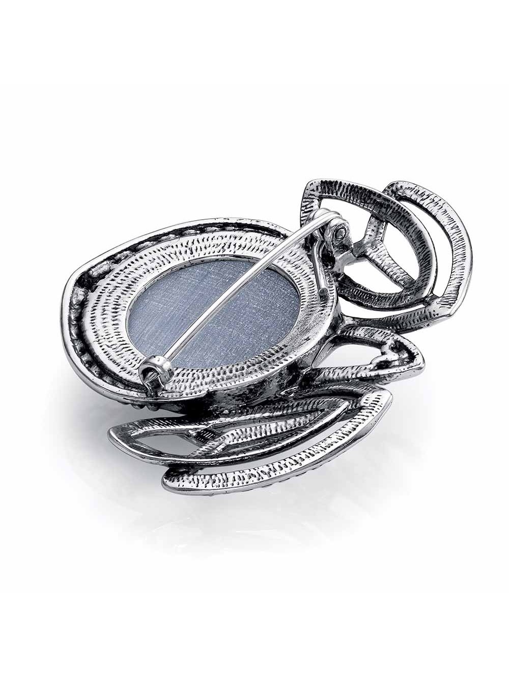Брошь бижутерия, покрытие - серебрение с оксидированием, вставка - искусственный кошачий глаз