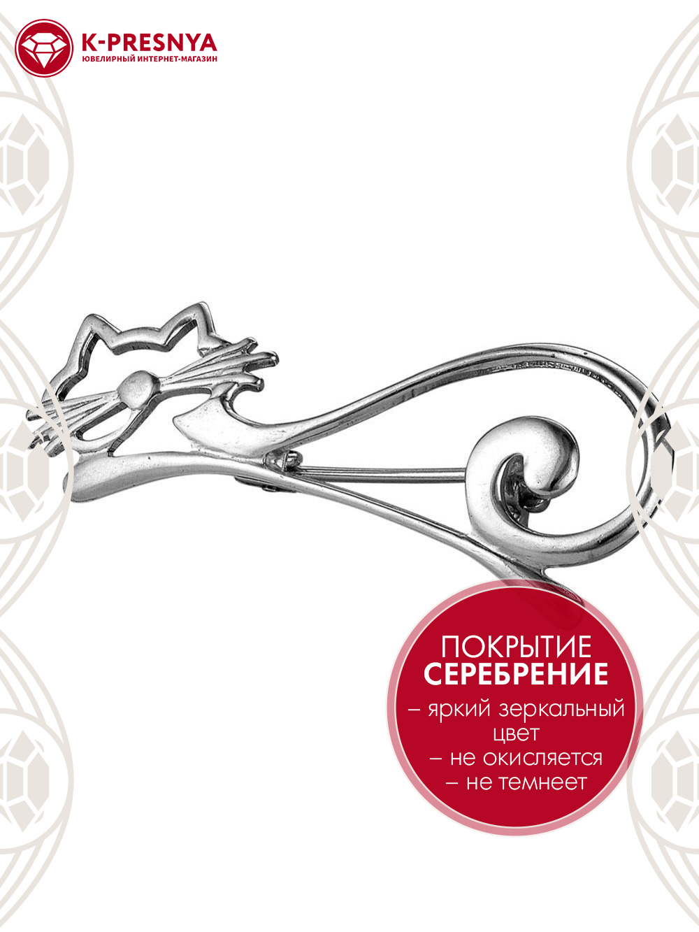 Брошь бижутерия, покрытие - серебрение с оксидированием, без вставок