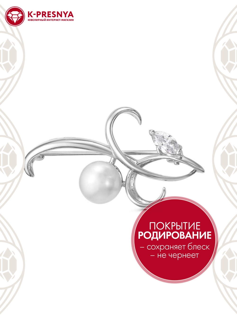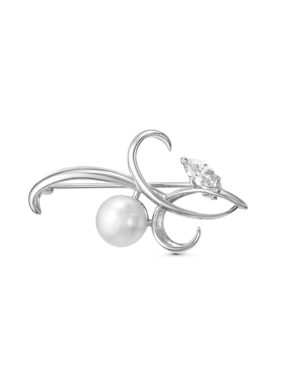 Брошь серебро 925 пробы, покрытие - родирование, вставка - культивированный жемчуг, фианит (недрагоценный камень)