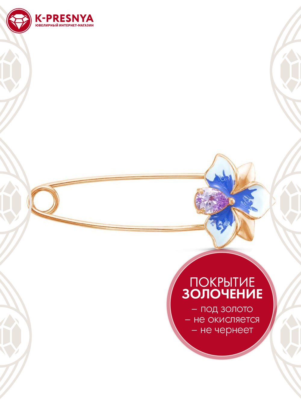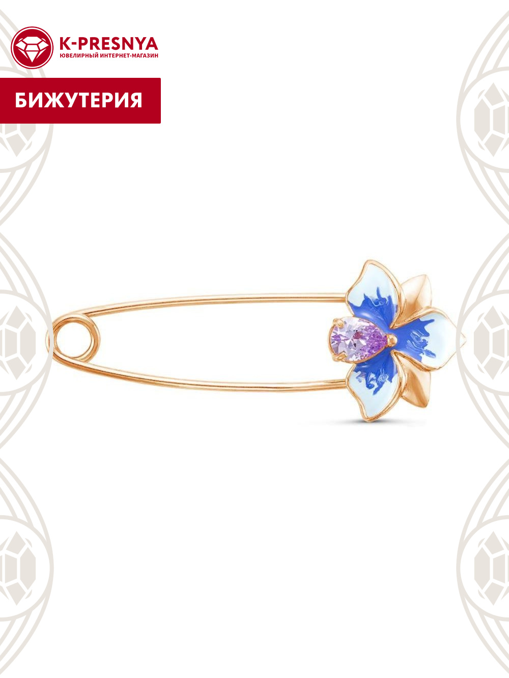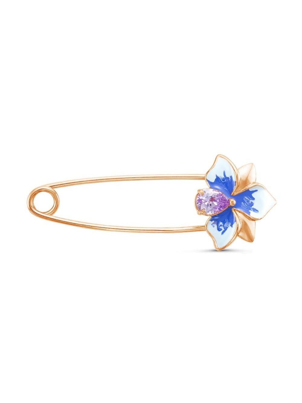 Брошь бижутерия, покрытие - золочение, отделка - эмаль, вставка - фианит (недрагоценный камень)