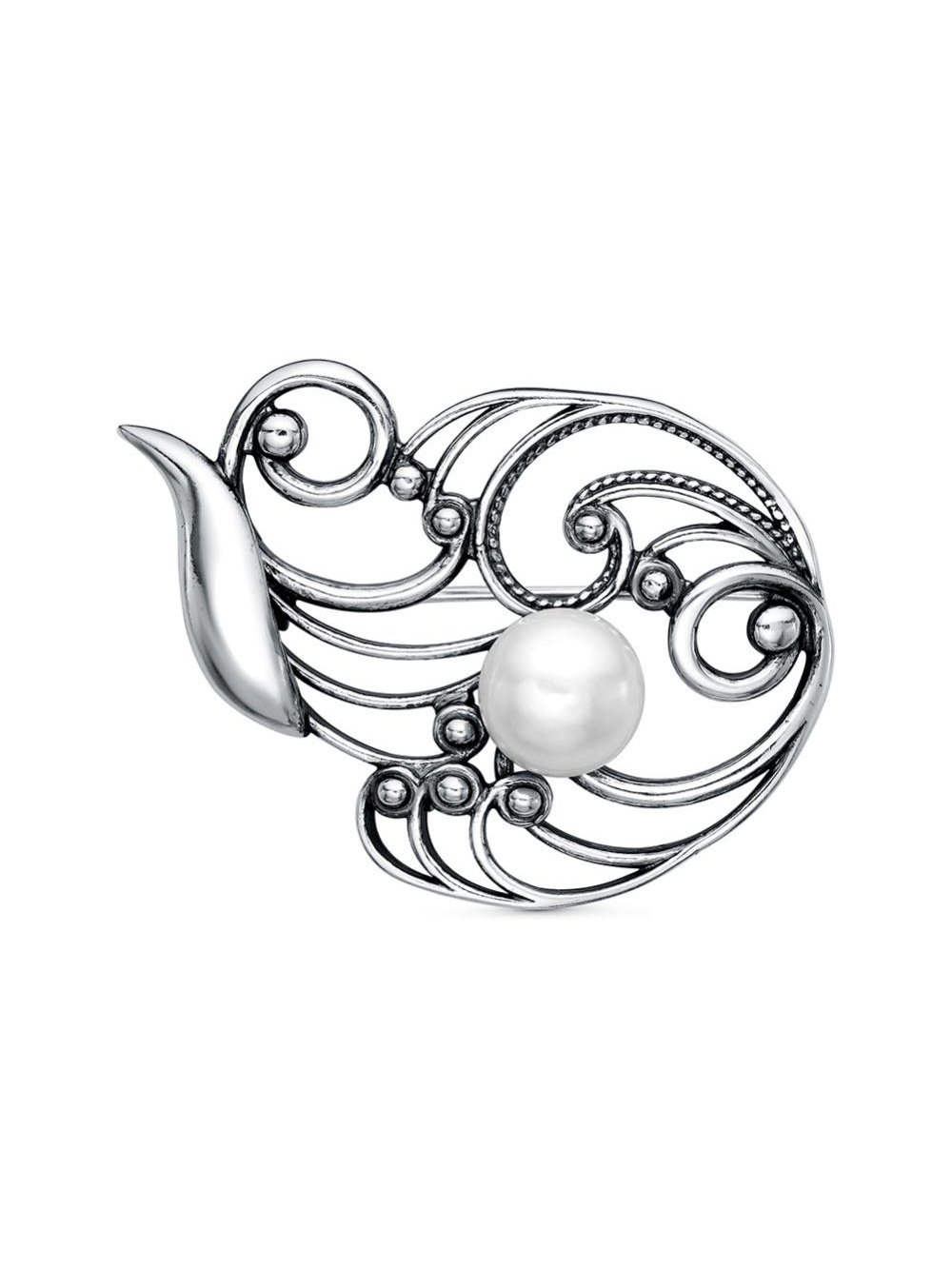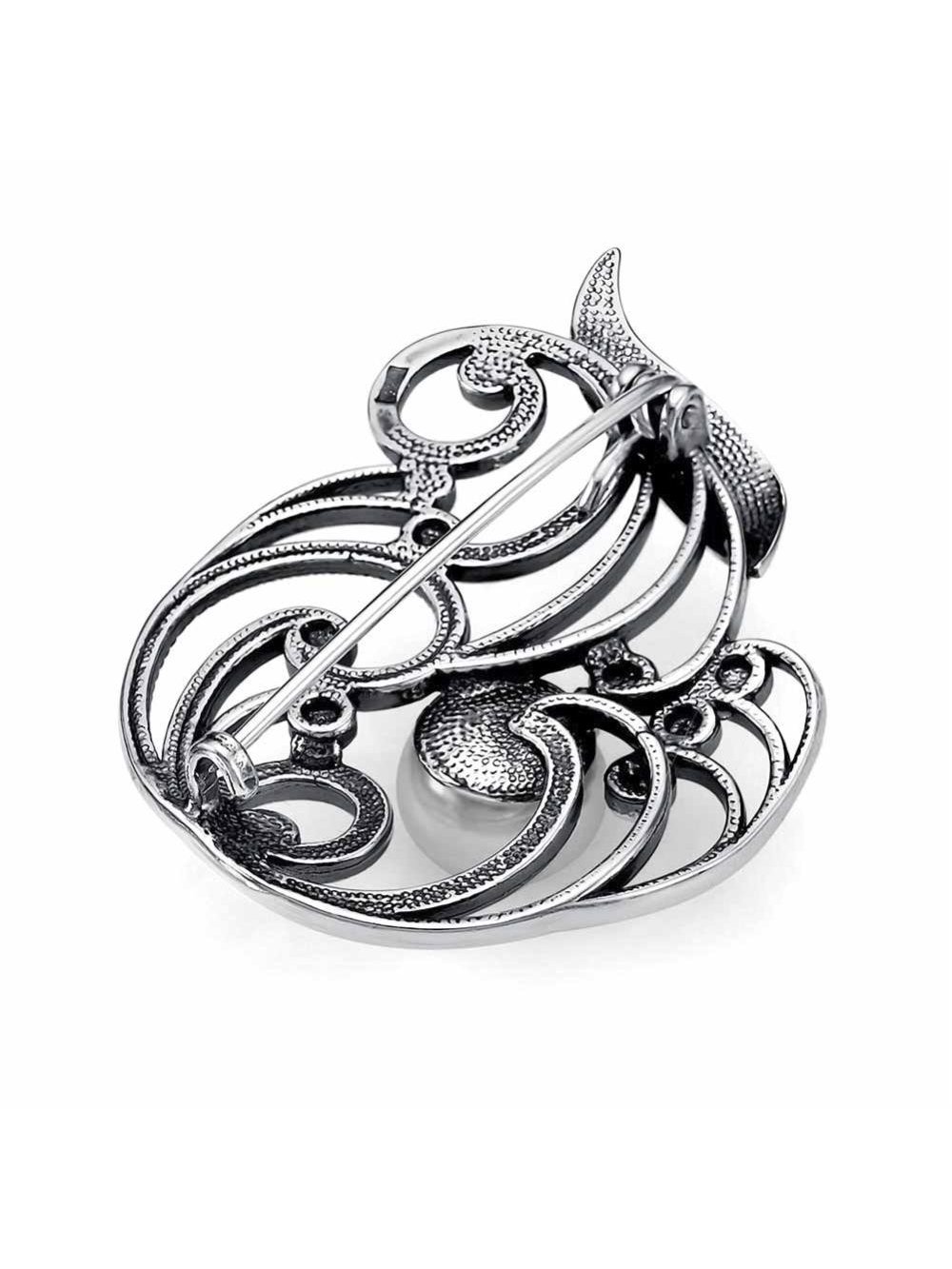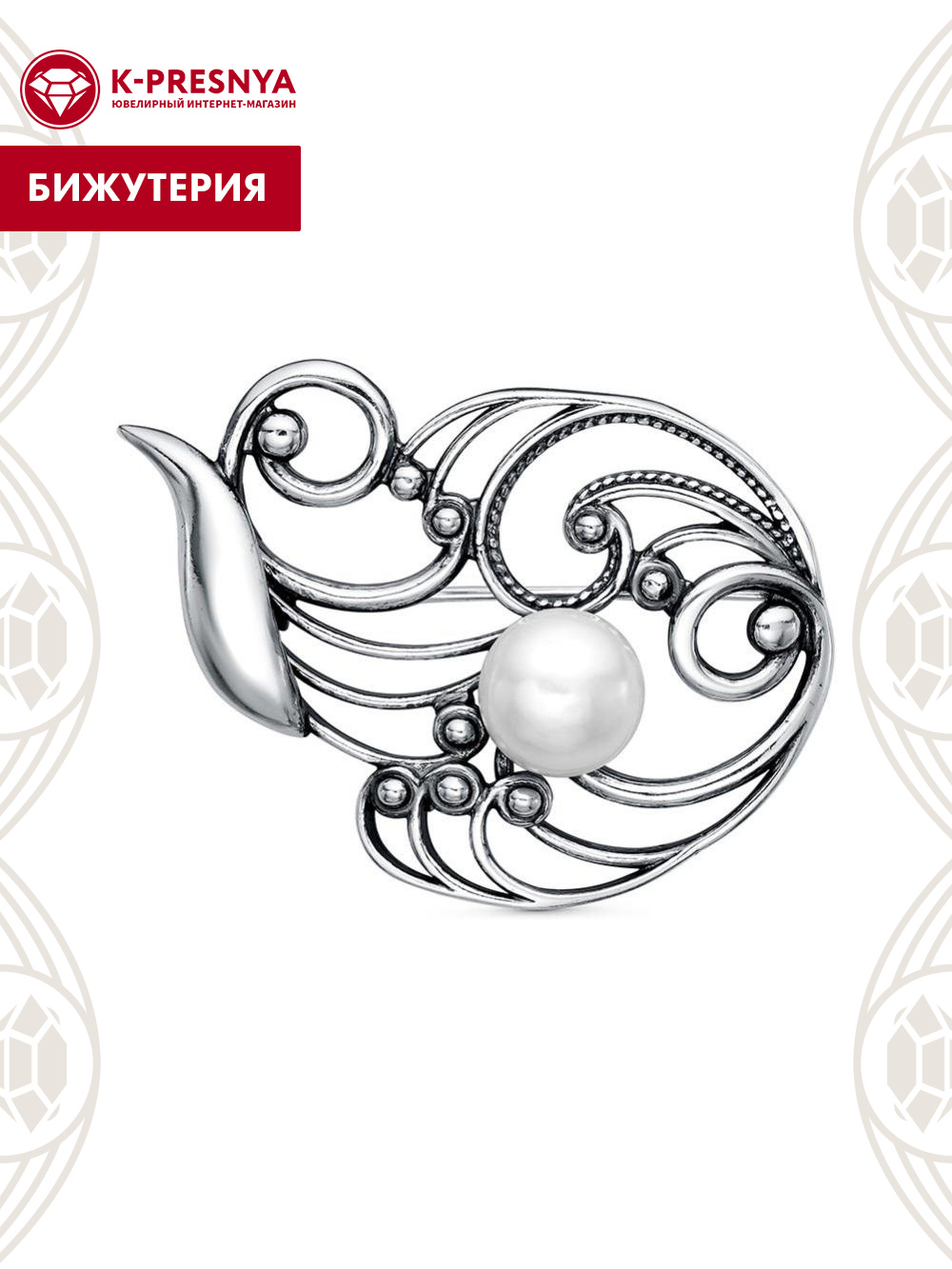 Брошь бижутерия, покрытие - серебрение с оксидированием, вставка - культивированный жемчуг