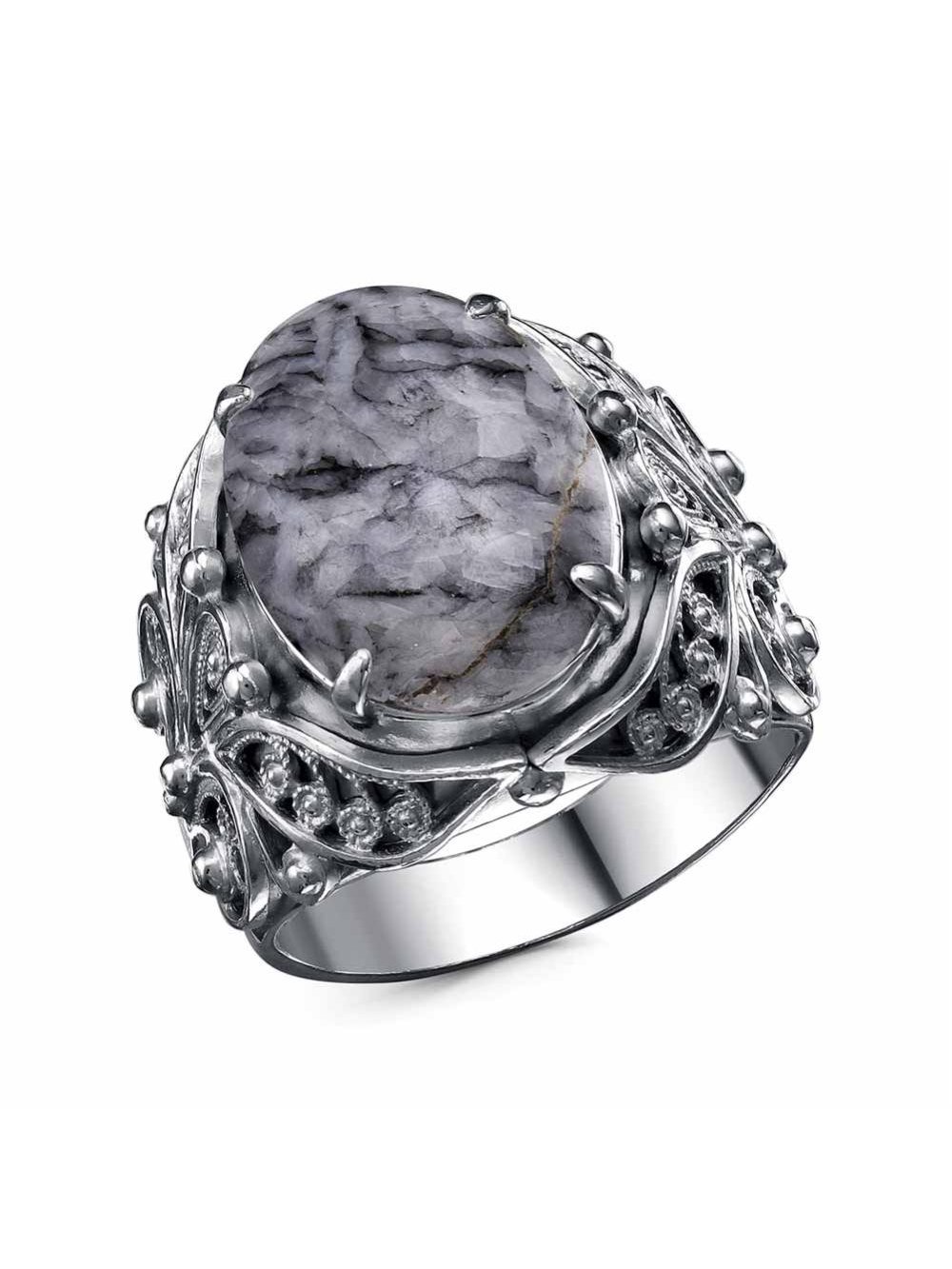 Кольцо бижутерия, покрытие - серебрение с оксидированием, вставка - пинолит