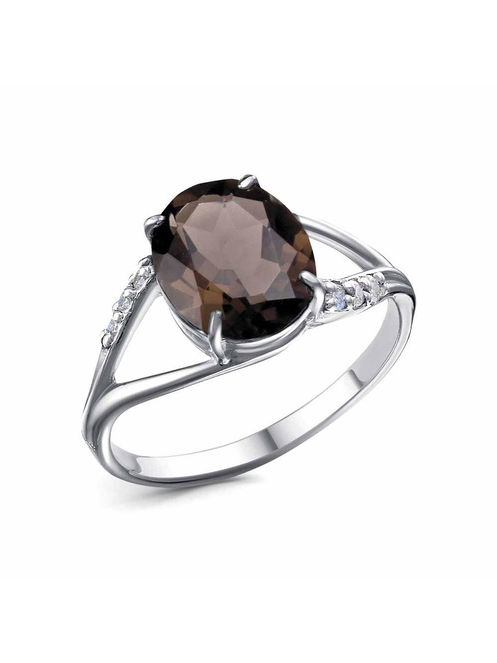 Кольцо серебро 925 пробы, покрытие - родирование, вставка - дымчатый кварц, фианит (недрагоценный камень)