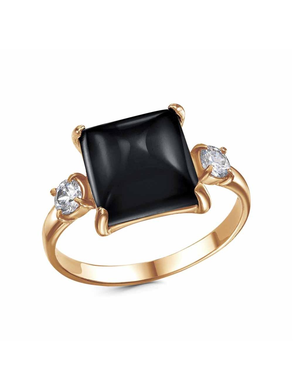 Кольцо бижутерия, покрытие - золочение, вставка - искусственный агат черный, фианит (недрагоценный камень)