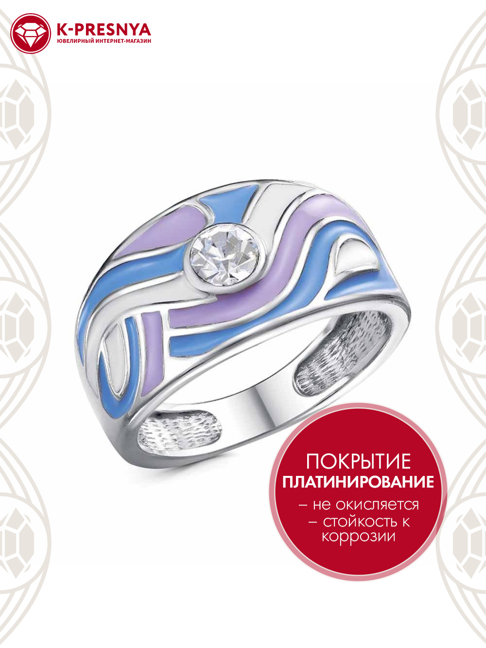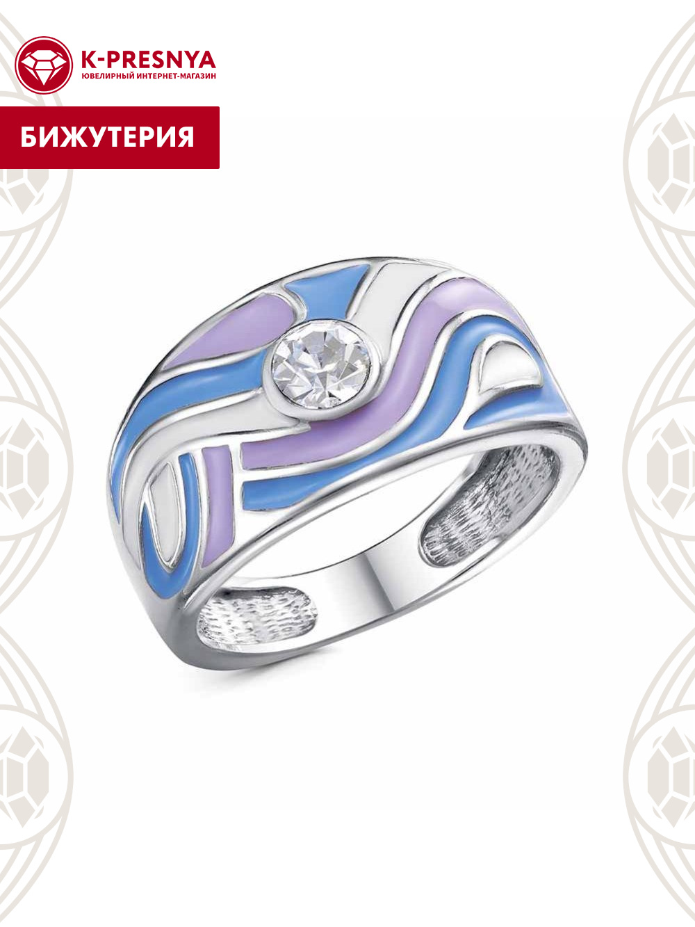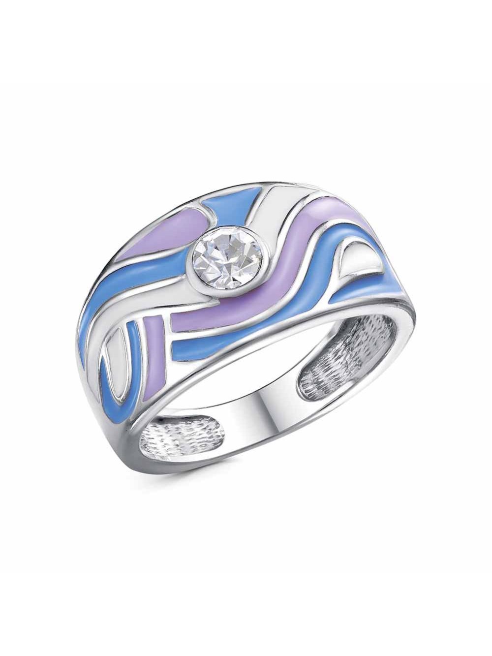 Кольцо бижутерия, покрытие - платинирование, отделка - эмаль, вставка - стекло ювелирное preciosa