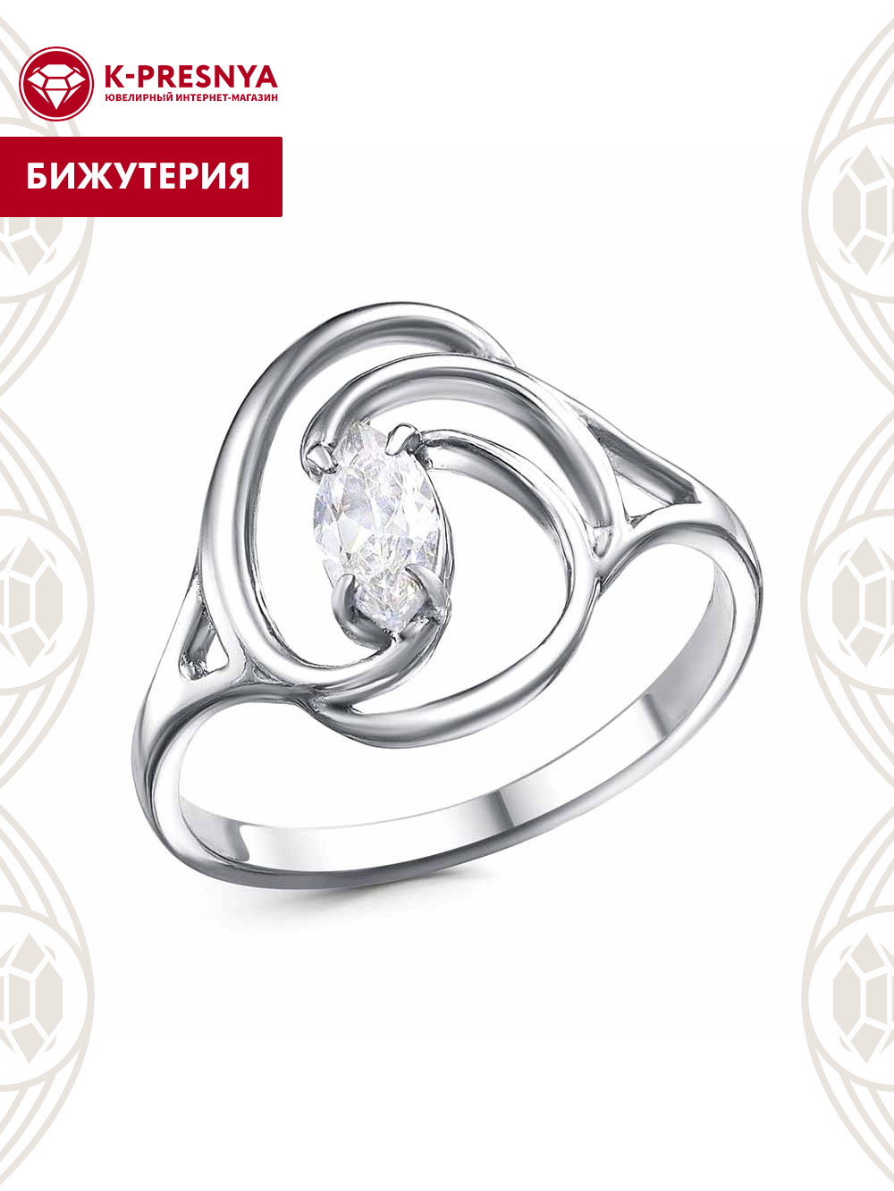 Кольцо бижутерия, покрытие - платинирование, вставка - фианит (недрагоценный камень)