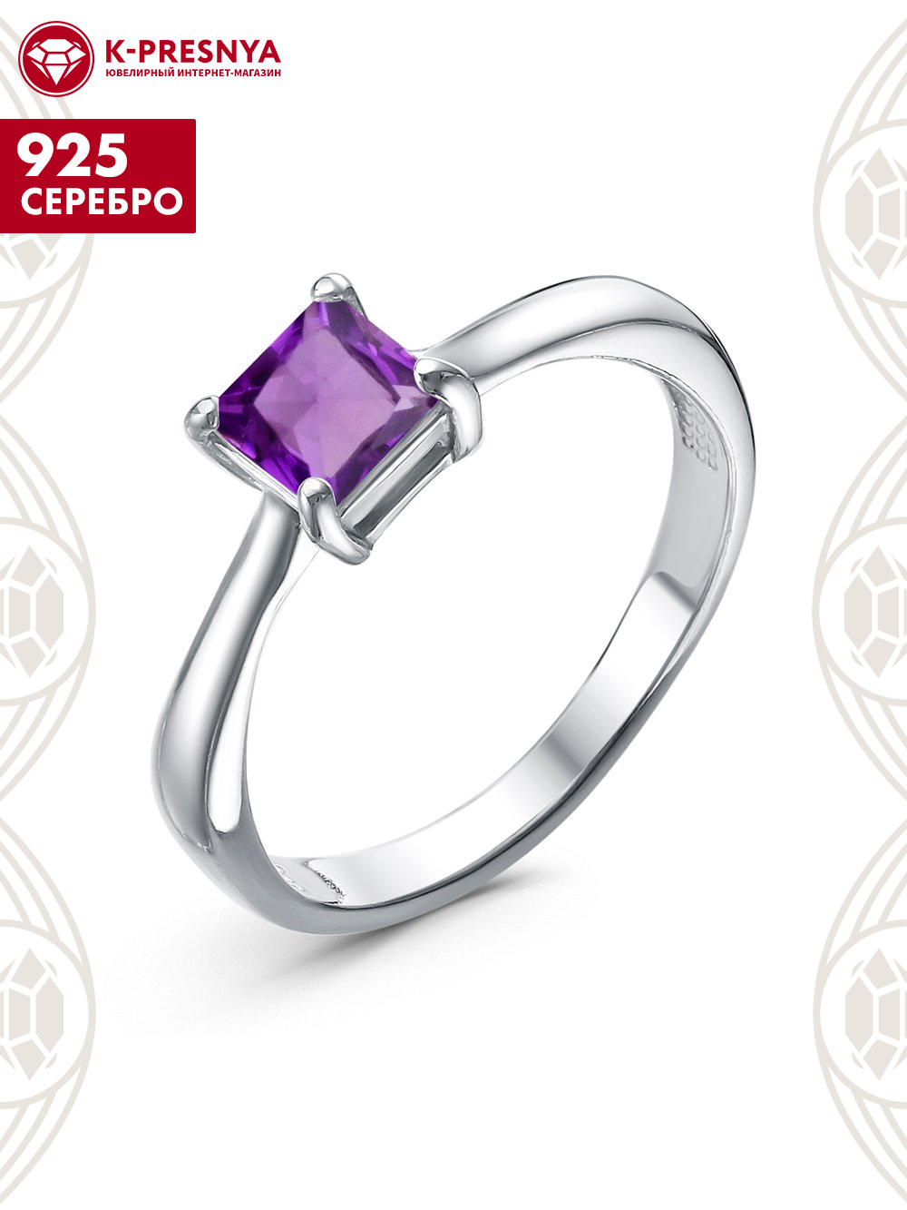 Кольцо серебро 925 пробы, покрытие - родирование, вставка - аметист (полудрагоценный камень)