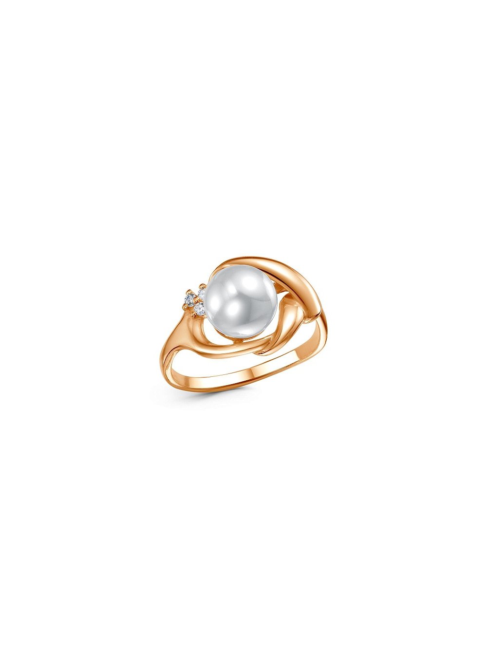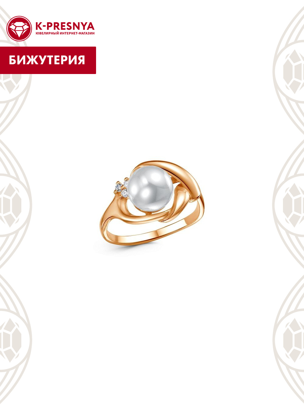Кольцо бижутерия, покрытие - золочение, вставка - имитация жемчуга, фианит (недрагоценный камень)