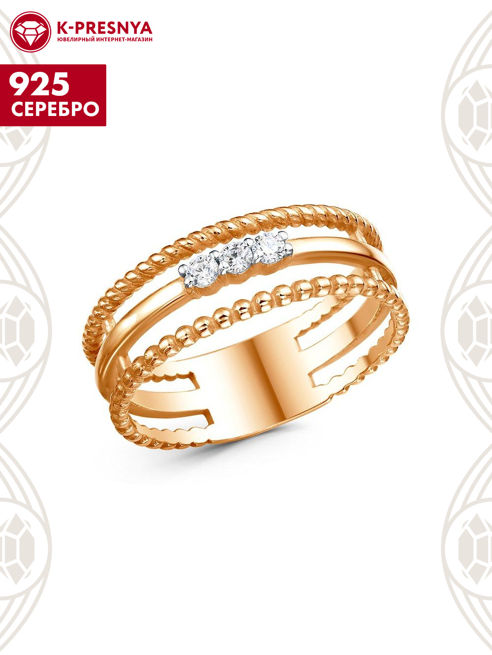 Кольцо серебро 925 пробы, покрытие - золочение, выборочное родирование, вставка - фианит (недрагоценный камень)