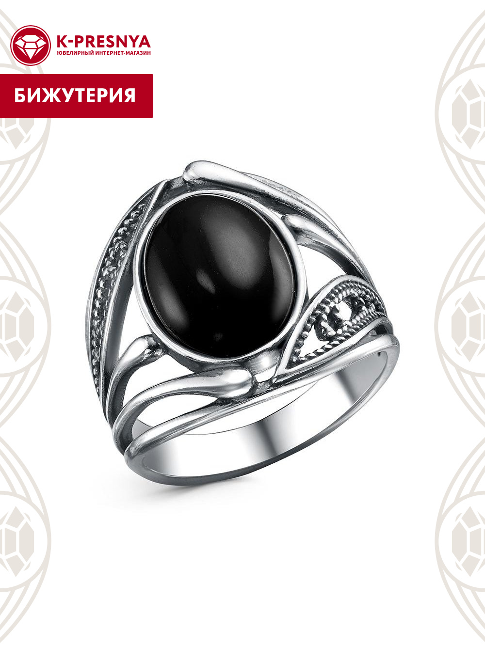 Кольцо бижутерия, покрытие - серебрение с оксидированием, вставка - искусственный агат