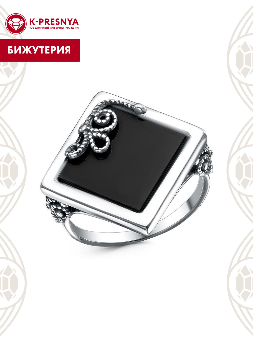 Кольцо бижутерия, покрытие - серебрение с оксидированием, вставка - искусственный агат черный
