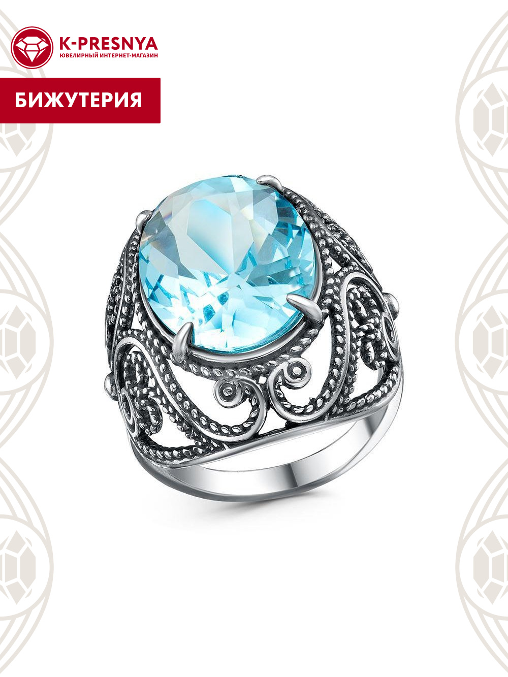 Кольцо бижутерия, покрытие - серебрение с оксидированием, вставка - синтетический кварц собственной огранки