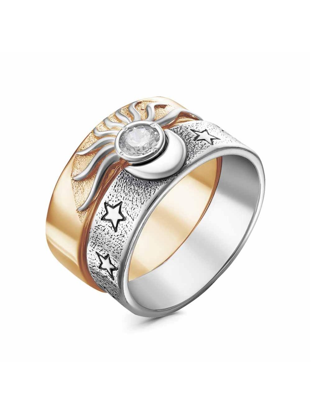 Кольцо бижутерия, покрытие - серебрение с оксидированием, выборочное золочение, вставка - фианит (недрагоценный камень)