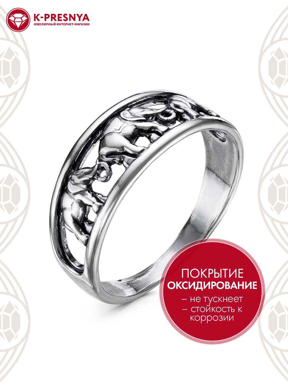 Кольцо со слонами - символ священной мудрости, достоинства и благоразумия. Кольцо приносит счастье и удачу своему обладателю.
