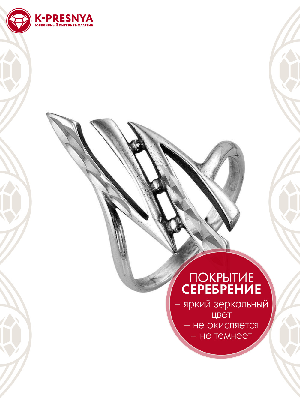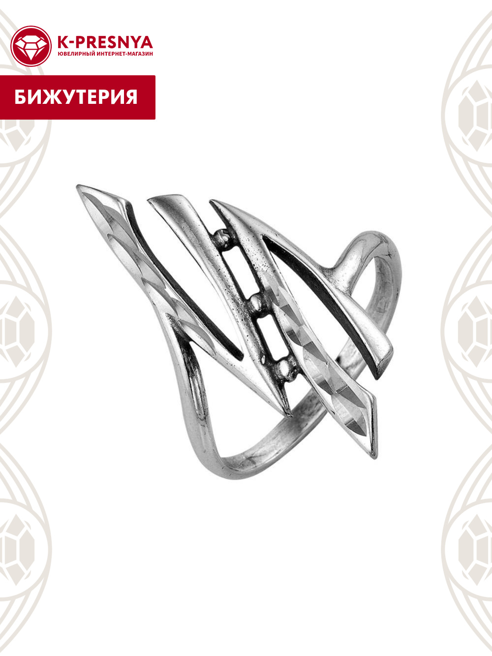 Кольцо бижутерия, покрытие - серебрение с оксидированием, отделка - алмазная грань, без вставок