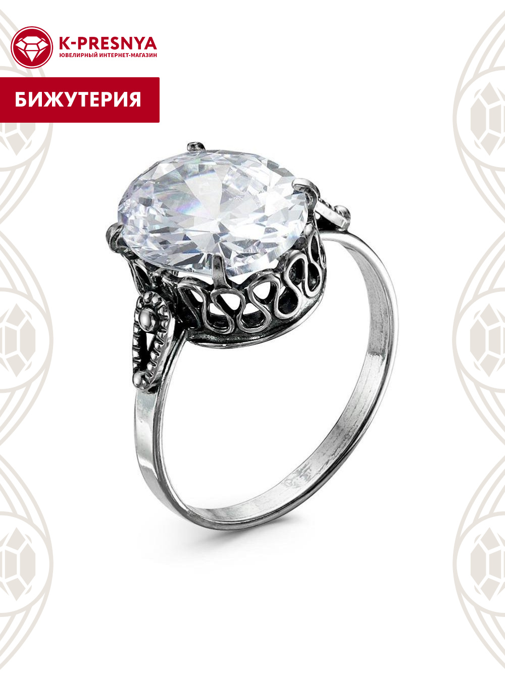 Кольцо бижутерия, покрытие - серебрение с оксидированием, вставка - стекло ювелирное