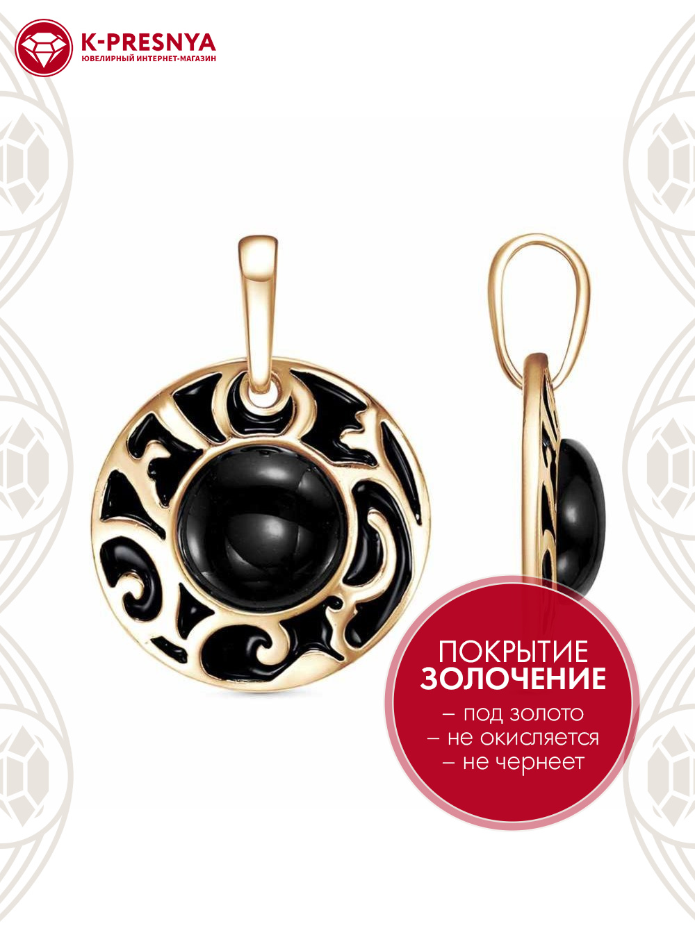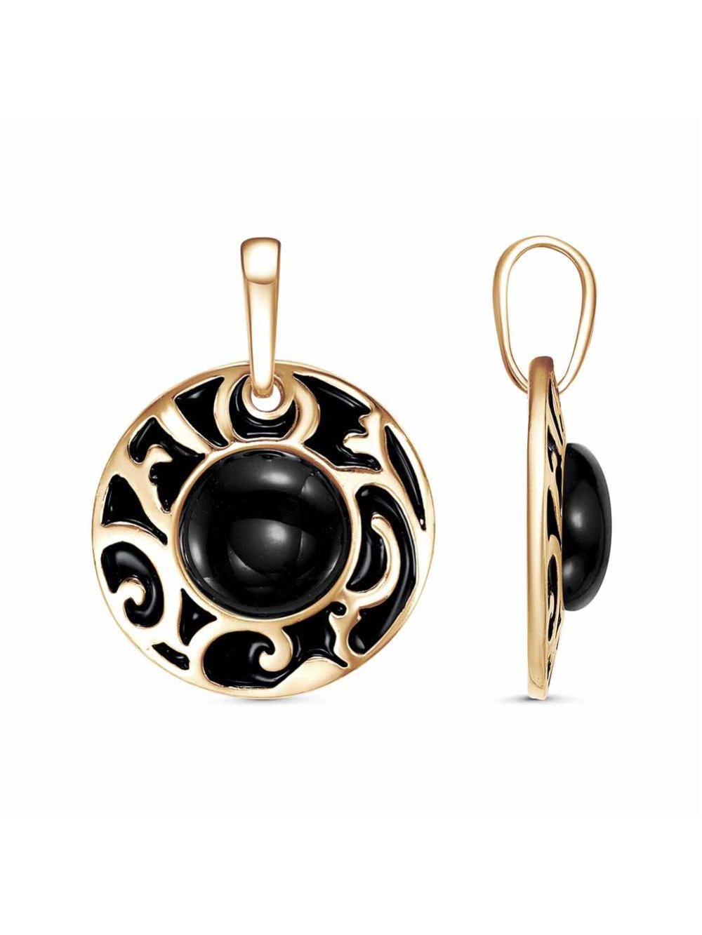 Подвеска бижутерия, покрытие - золочение, отделка - эмаль, вставка - искусственный агат черный