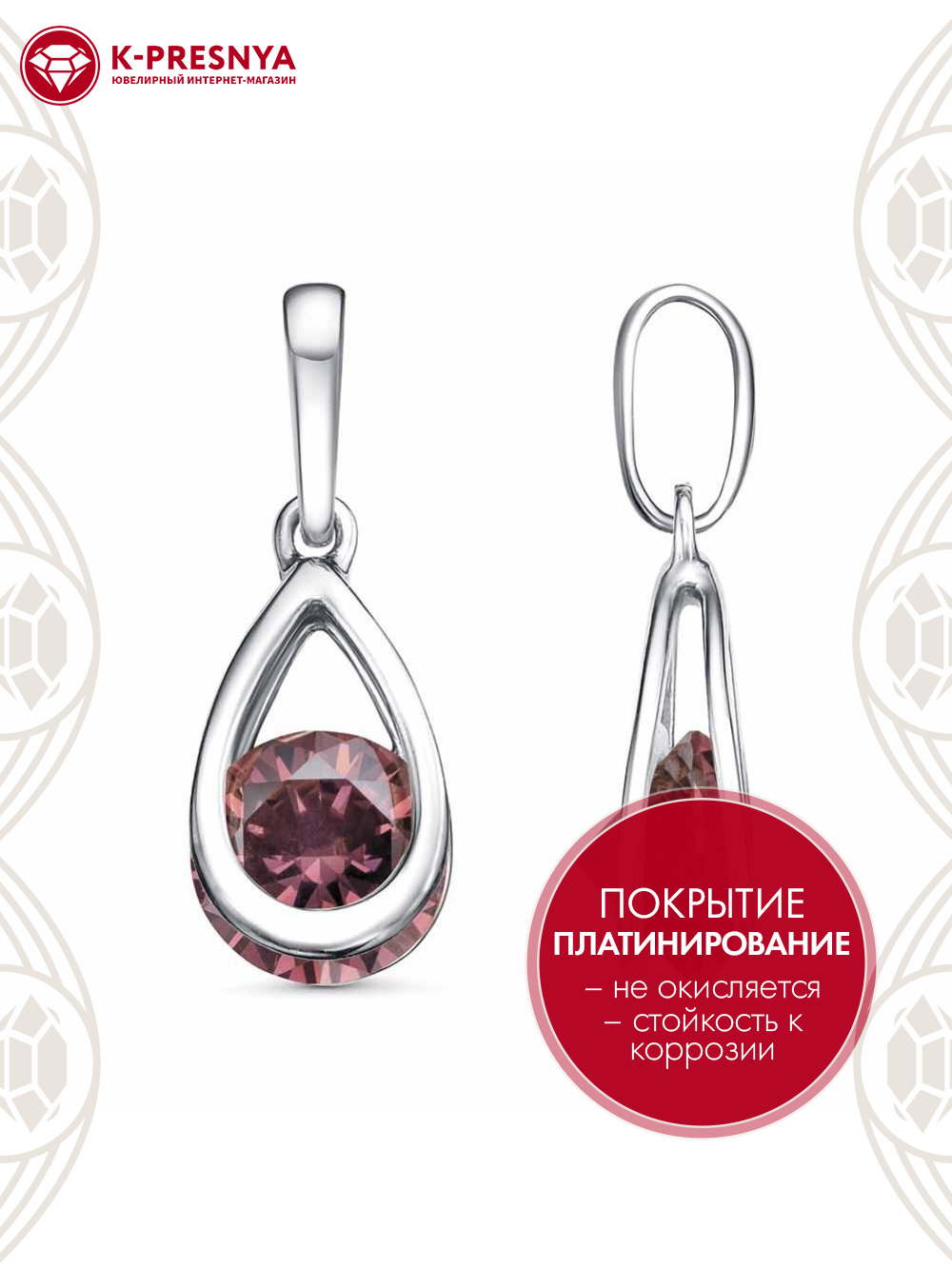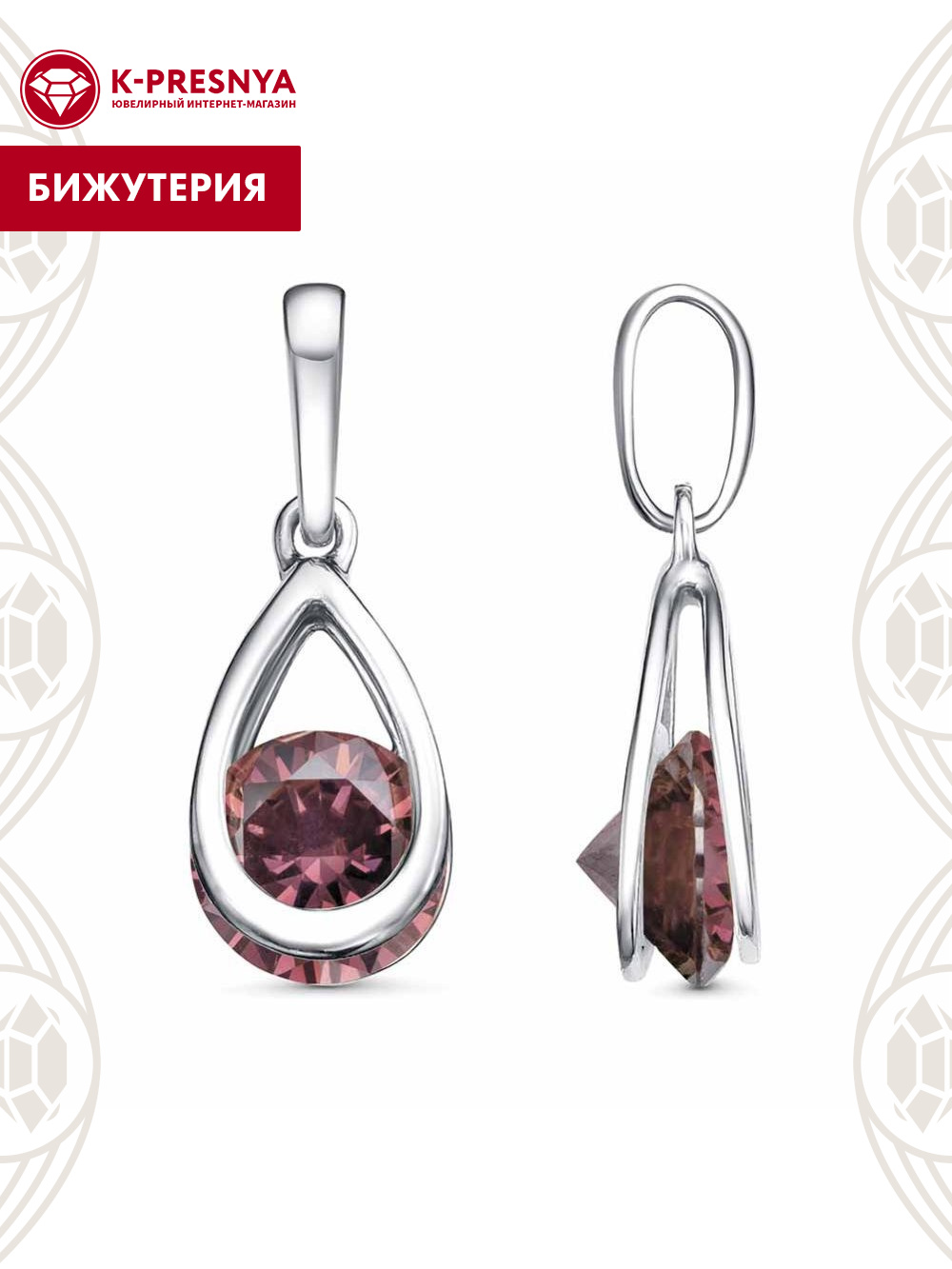 Подвеска бижутерия, покрытие - платинирование, вставка - фианит (недрагоценный камень)