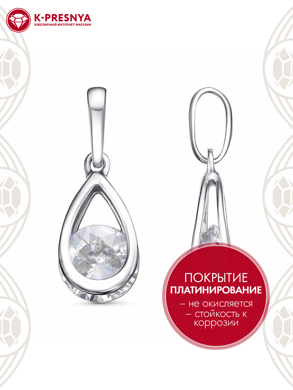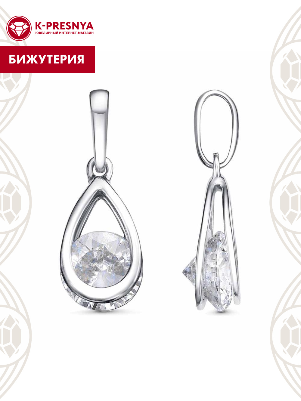 Подвеска бижутерия, покрытие - платинирование, вставка - фианит (недрагоценный камень)