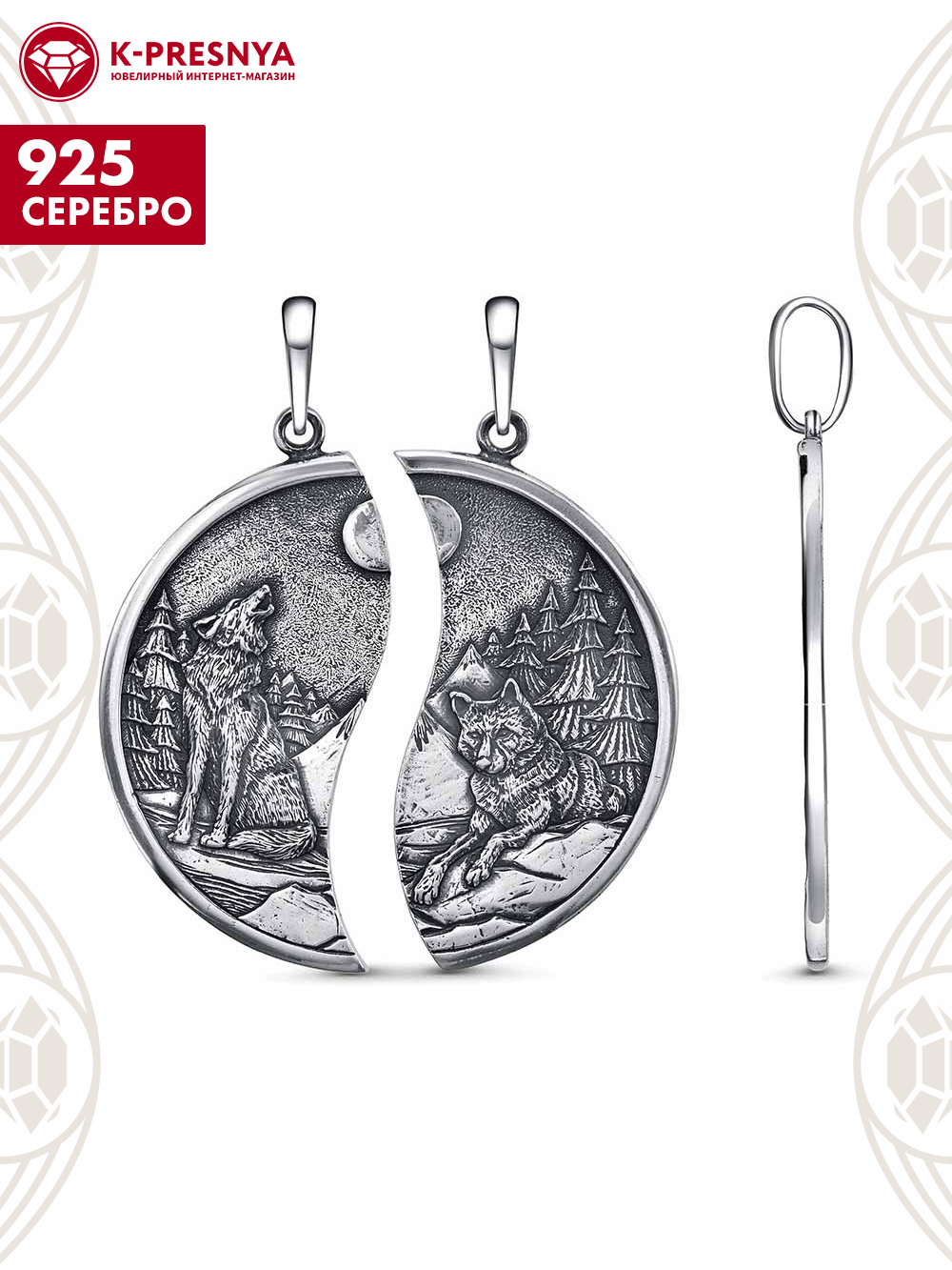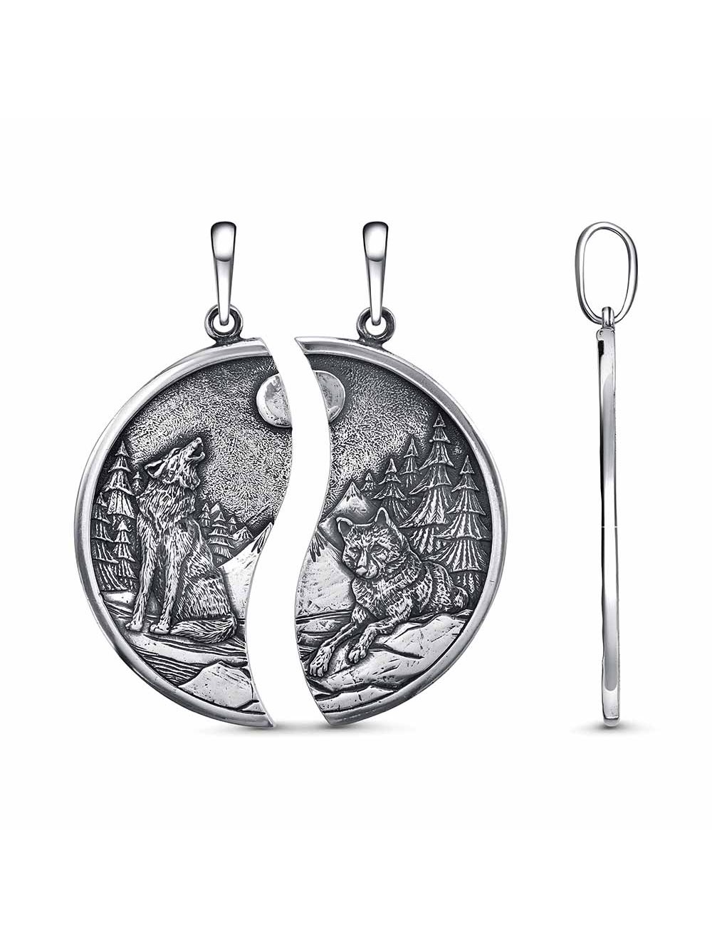 Представляем вам парную подвеску из серебра 925 пробы, на которой изображены волк и волчица. Эти таинственные создания природы олицетворяют силу и защиту. Волк- это символ верности, преданности и крепкой связи, поскольку он неразделим со своей стаей и семьей. Стильная серебряная подвеска станет не только украшением, но и напоминанием о важности любви, поддержки и взаимопонимания между партнёрами.