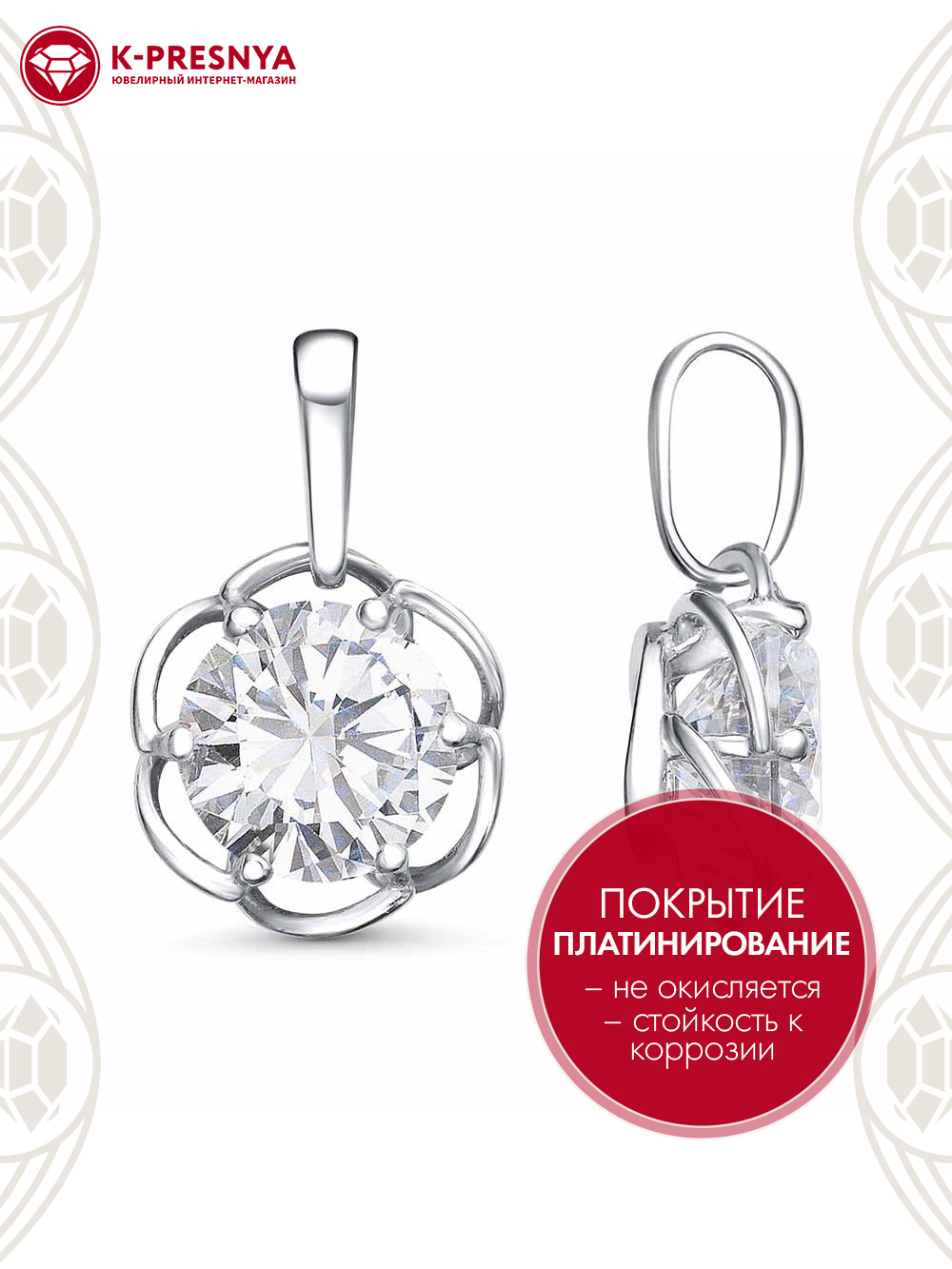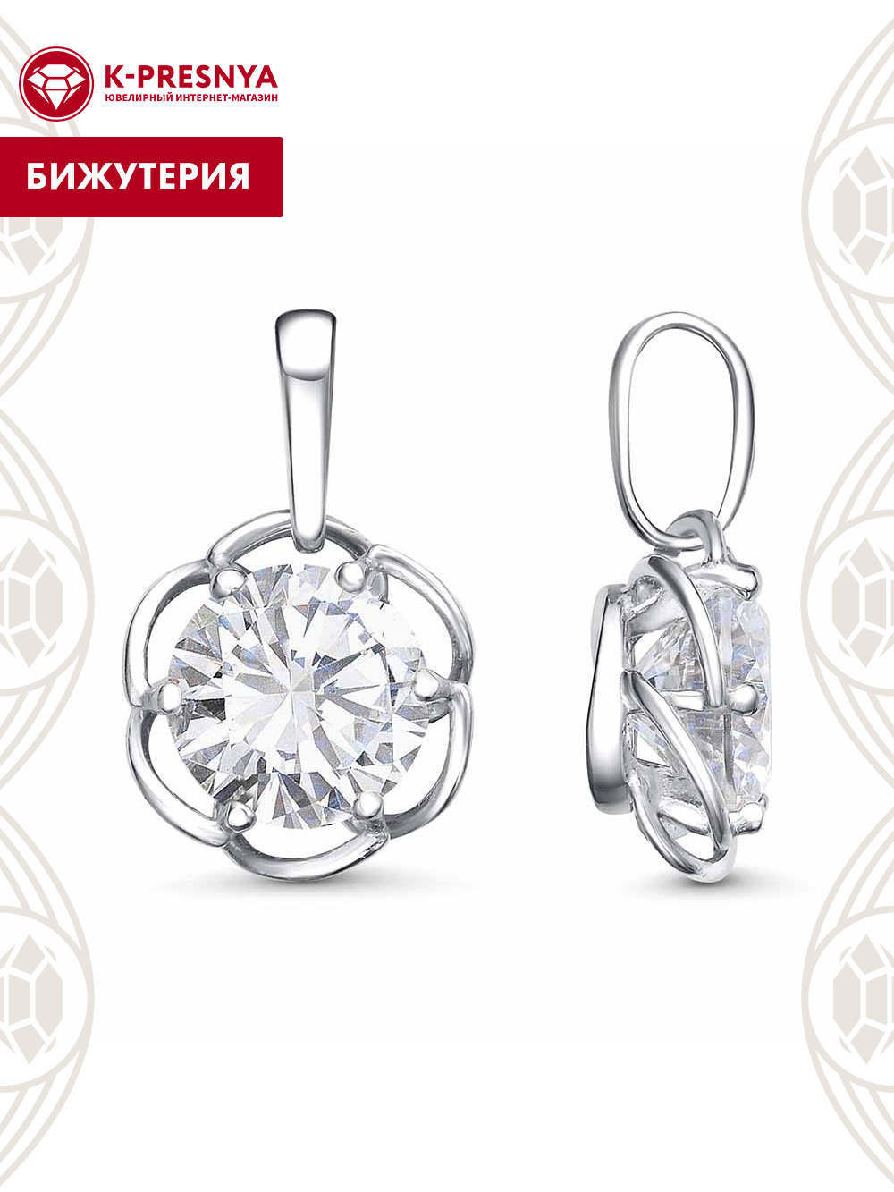Подвеска бижутерия, покрытие - платинирование, вставка - фианит (недрагоценный камень)