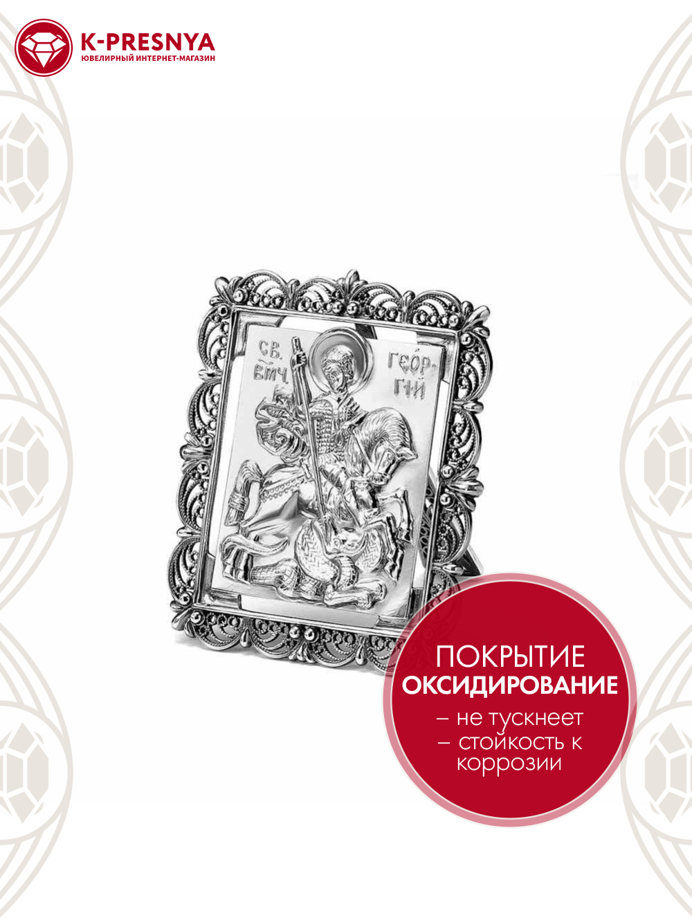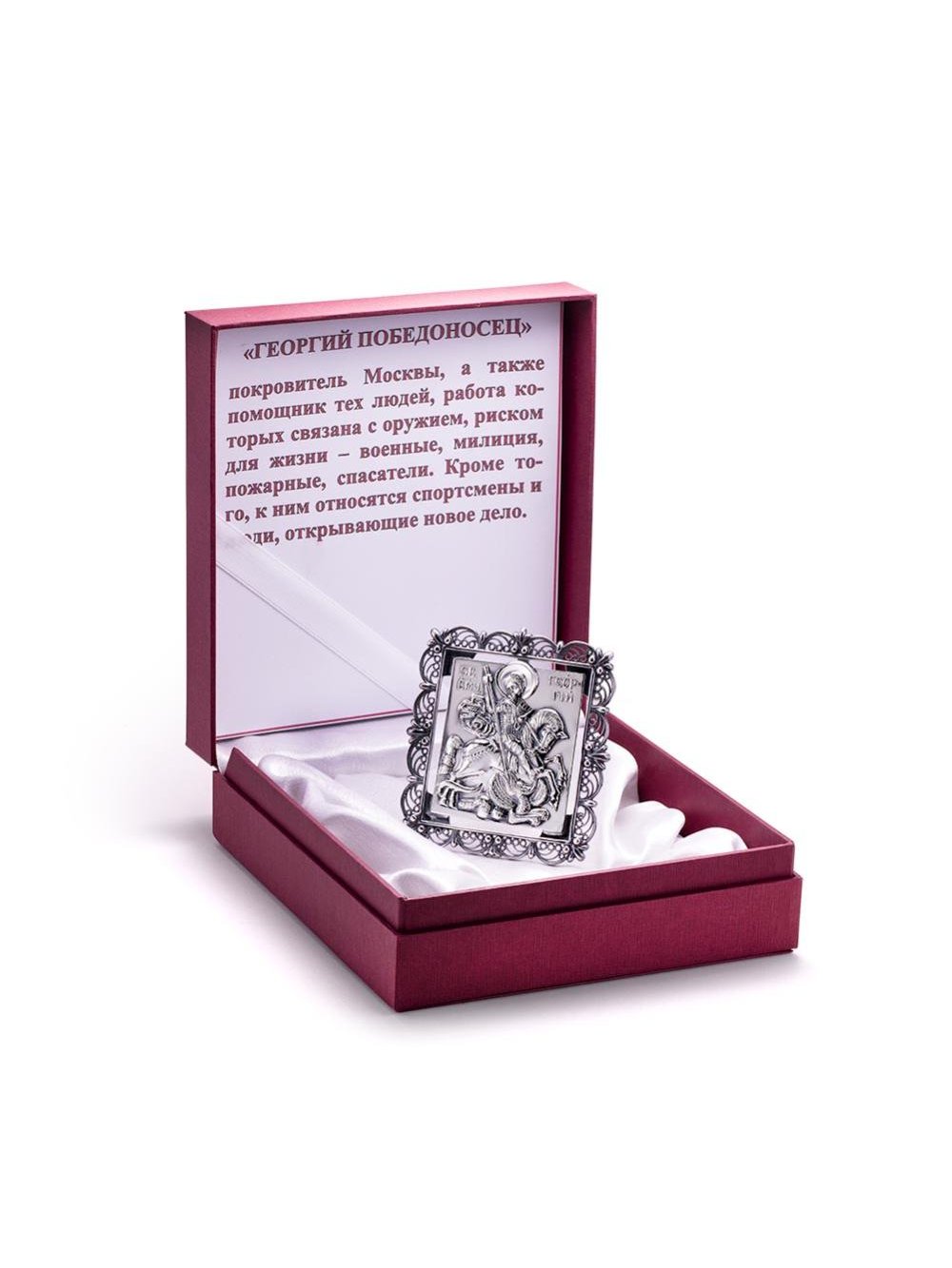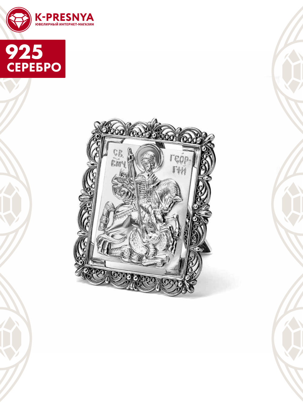 Икона Георгий Победоносец изготовлена из серебра 925°. Красивый, витиеватый орнамент иконы выполнен в традиционной технике скань. Святой великомученик почитаем в России как покровитель российского воинства и державной мощи Российского государства, а также как небесный покровитель российской столицы.