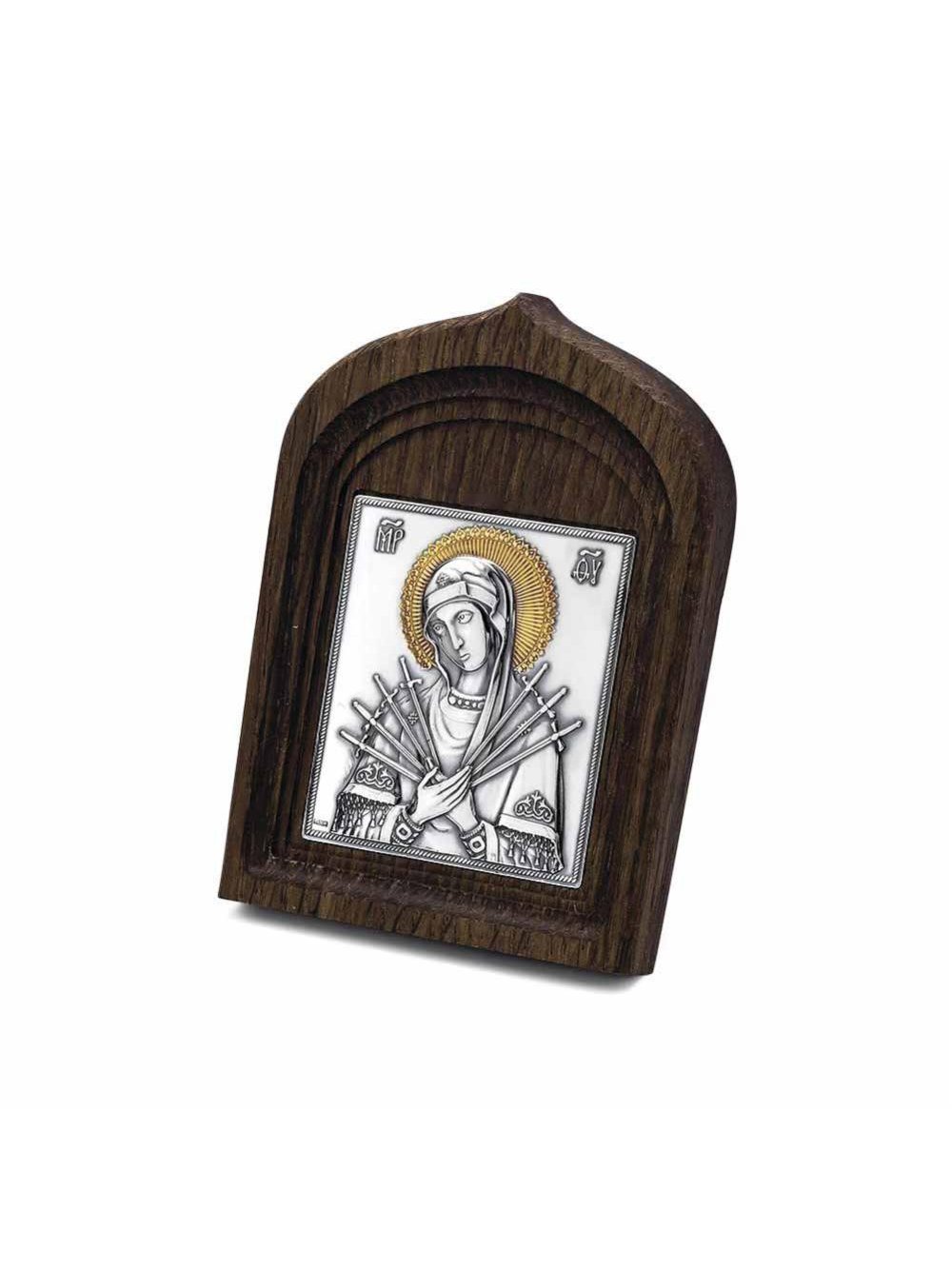 Семистрельная икона Божьей Матери - напоминает людям о спасительной для души необходимости милосердия, терпимости, иначе все проявления недобрых чувств, будто стрелы, пронзают грудь Богоматери. Многие семьи, в которых супружеские отношения складываются неблагополучно, прибегают к молитвам перед этой иконой, и в дом возвращаются взаимопонимание и лад.Темный оклад иконы изготовлен из дуба.