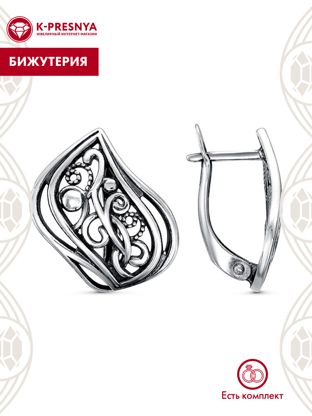 Серьги бижутерия, покрытие - серебрение с оксидированием, без вставок