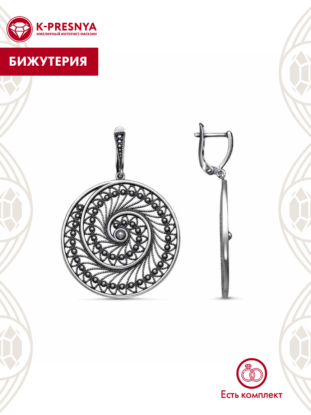Серьги бижутерия, покрытие - серебрение с оксидированием, без вставок