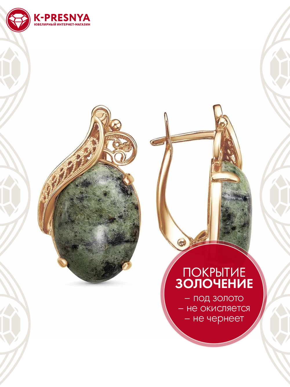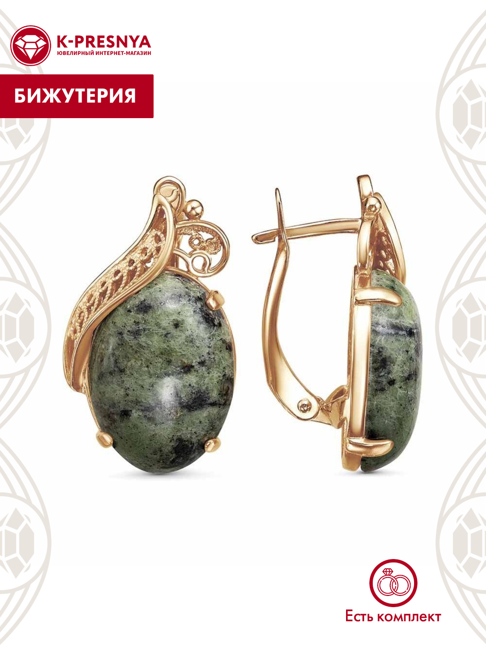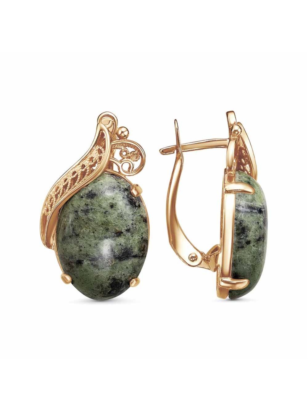 Серьги бижутерия, покрытие - золочение, вставка - змеевик