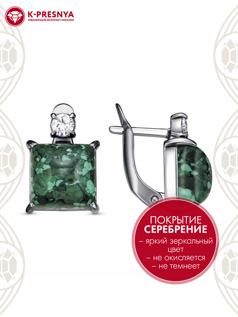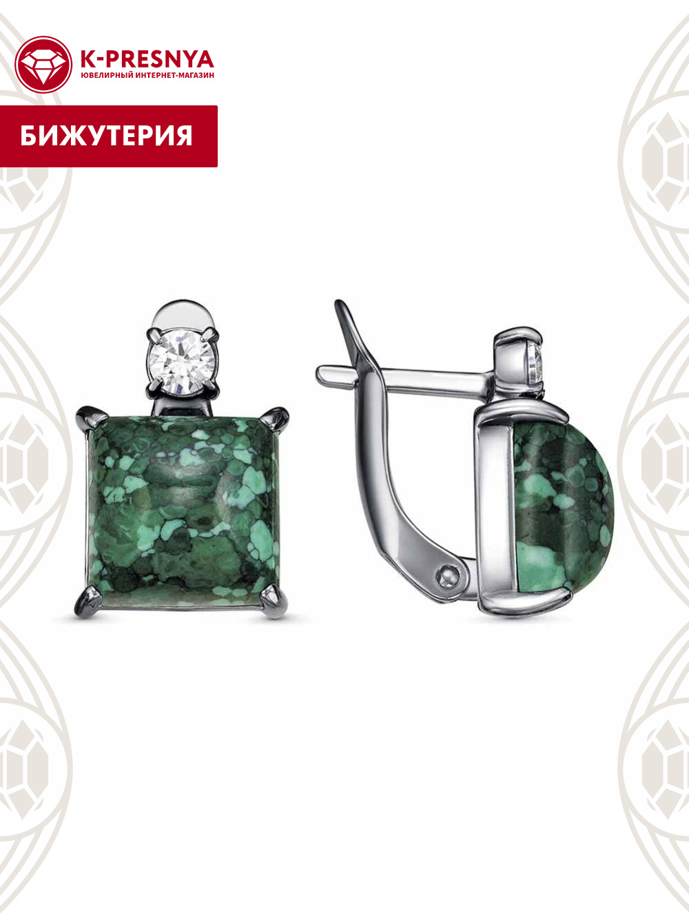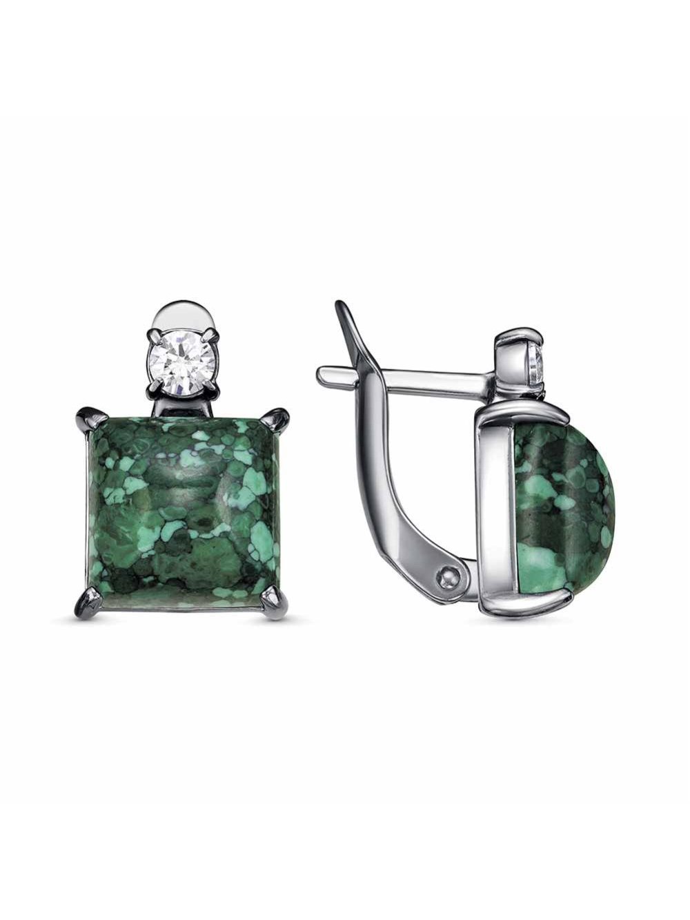 Серьги бижутерия, покрытие - серебрение с оксидированием, вставка - искусственный малахит , фианит (недрагоценный камень)