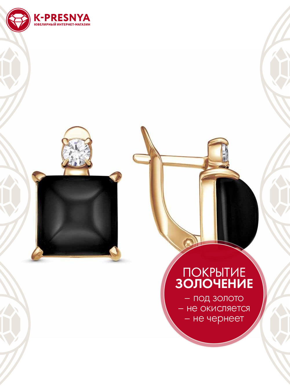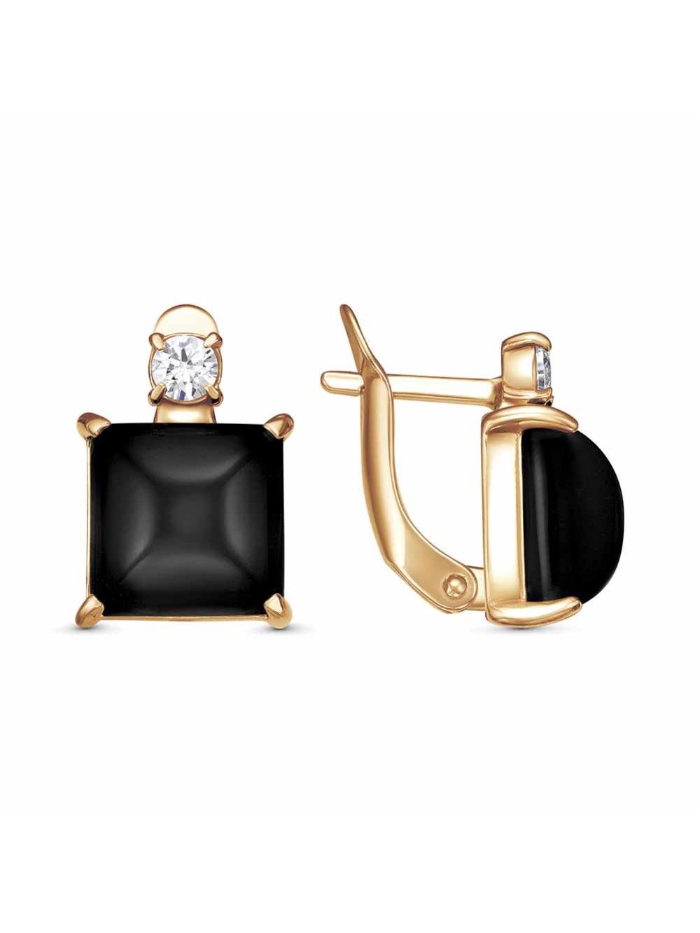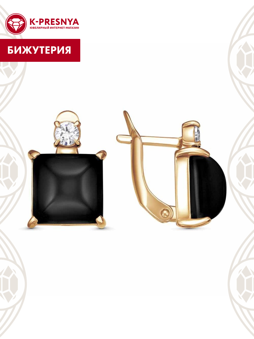 Серьги бижутерия, покрытие - золочение, вставка - искусственный агат черный, фианит (недрагоценный камень)