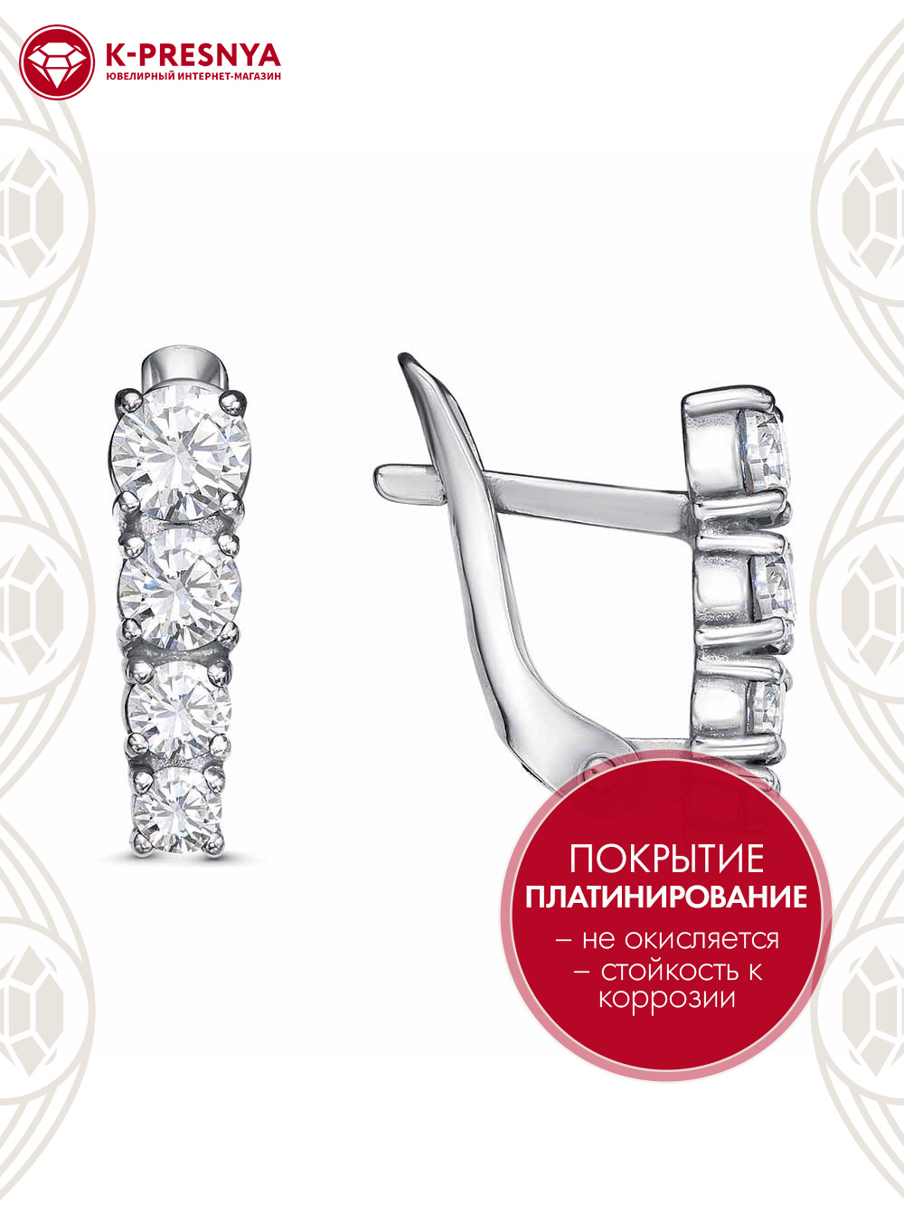 Серьги серебро 925 пробы, покрытие - платинирование, вставка - фианит (недрагоценный камень)