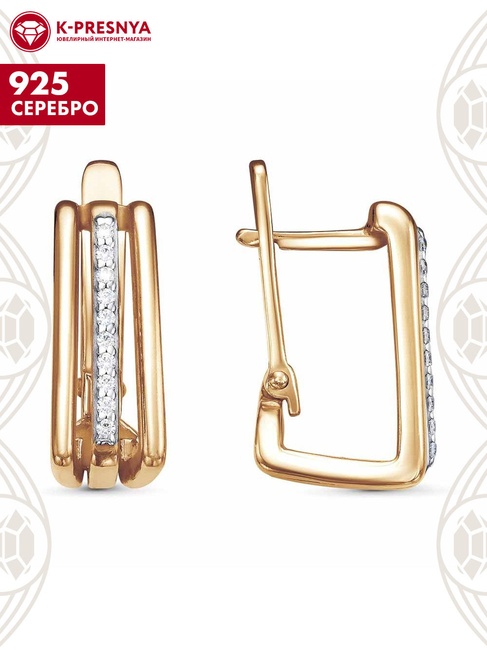 Серьги серебро 925 пробы, покрытие - золочение, выборочное родирование, вставка - фианит (недрагоценный камень)