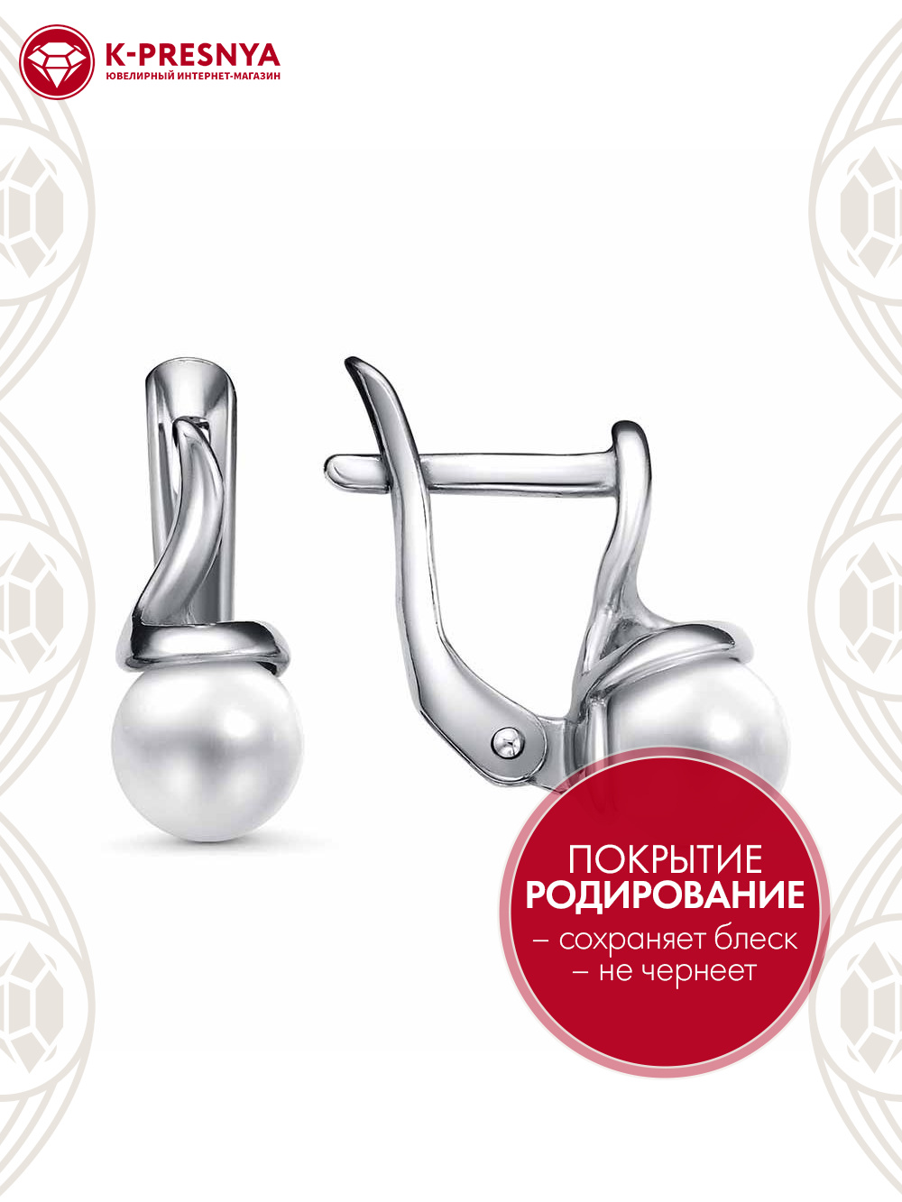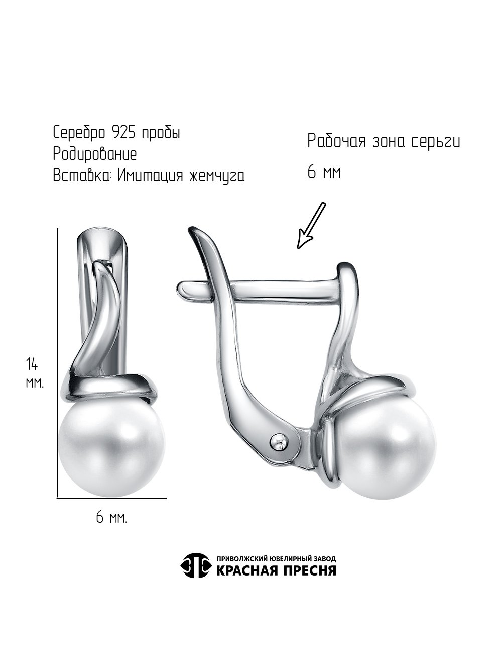 Серьги серебро 925 пробы, покрытие - родирование, вставка - имитация жемчуга
