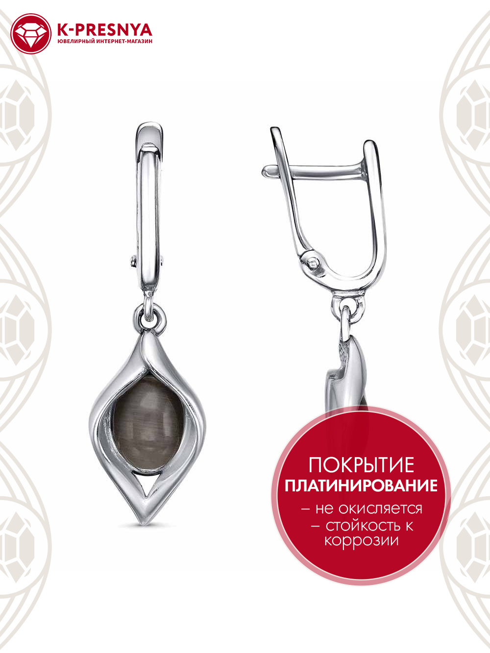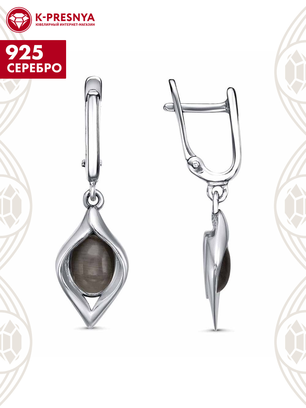 Серьги серебро 925 пробы, покрытие - платинирование, вставка - искусственный кошачий глаз