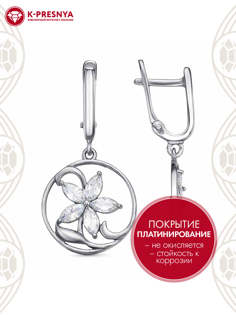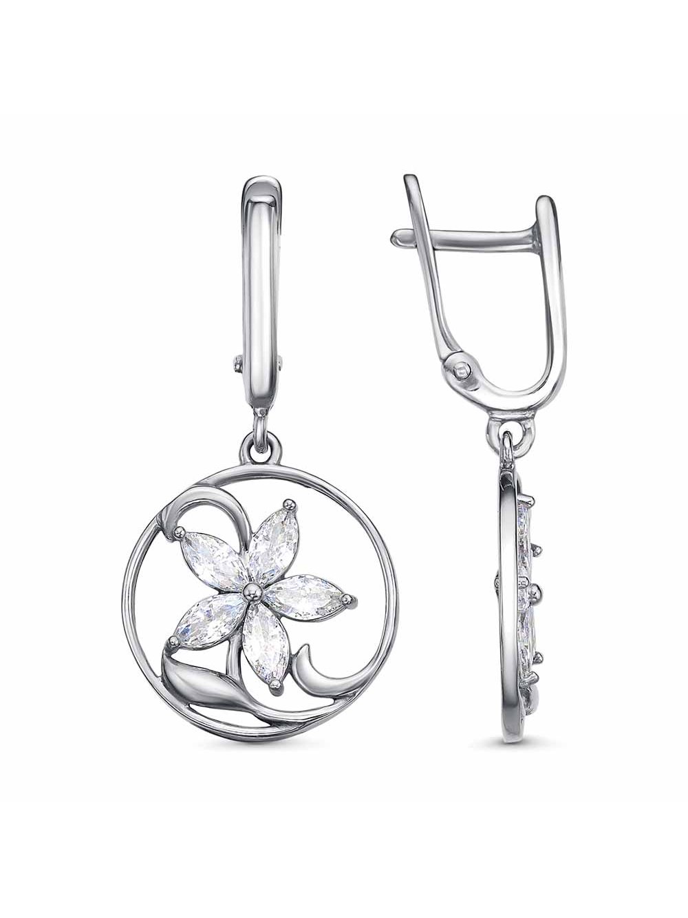 Серьги серебро 925 пробы, покрытие - платинирование, вставка - фианит (недрагоценный камень)